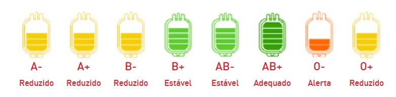 Por outro lado, os tipos A-A+B- e O+ estão em níveis reduzidos, destacados pela cor amarela. A situação mais preocupante é do tipo O-, cujo estoque está em nível crítico, indicado pela cor vermelha de alerta.