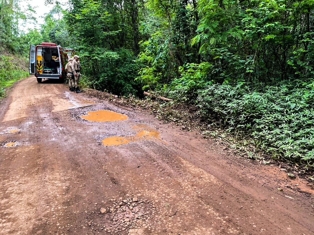 Ele foi encontrado dentro da Fiat/Strada placas de Descanso, capotada dentro do Rio Guamerim, Linha Santa Catarina.