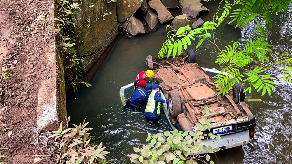 Conforme a Polícia Militar, populares viram o carro caído dentro do rio e acionaram o resgate.
