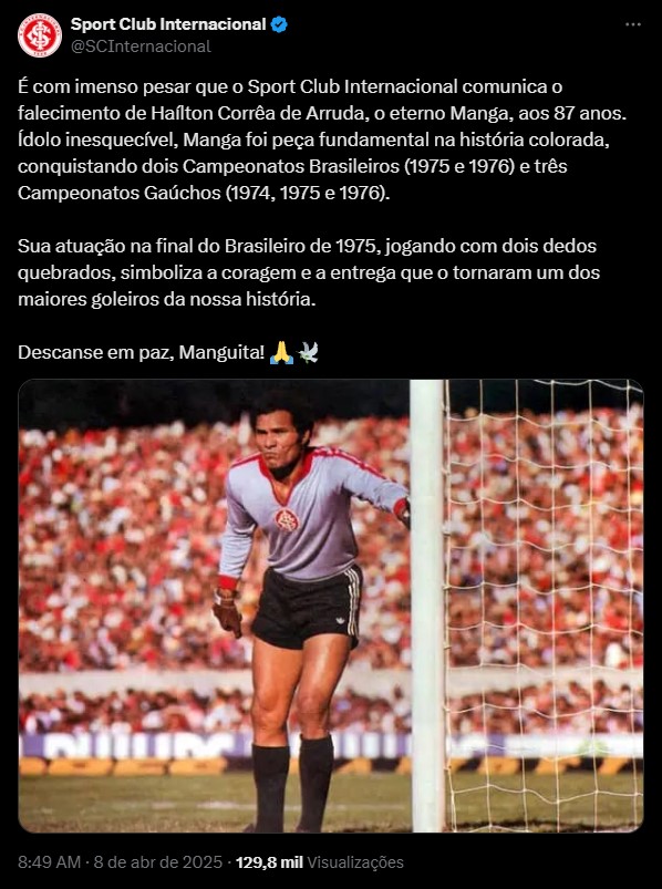 O Internacional publicou uma nota nas redes oficiais do clube em lamento à morte. “É com imenso pesar que o Sport Club Internacional comunica o falecimento de Haílton Corrêa de Arruda, o eterno Manga, aos 87 anos. Ídolo inesquecível, Manga foi peça fundamental na história colorada…”, diz um trecho.