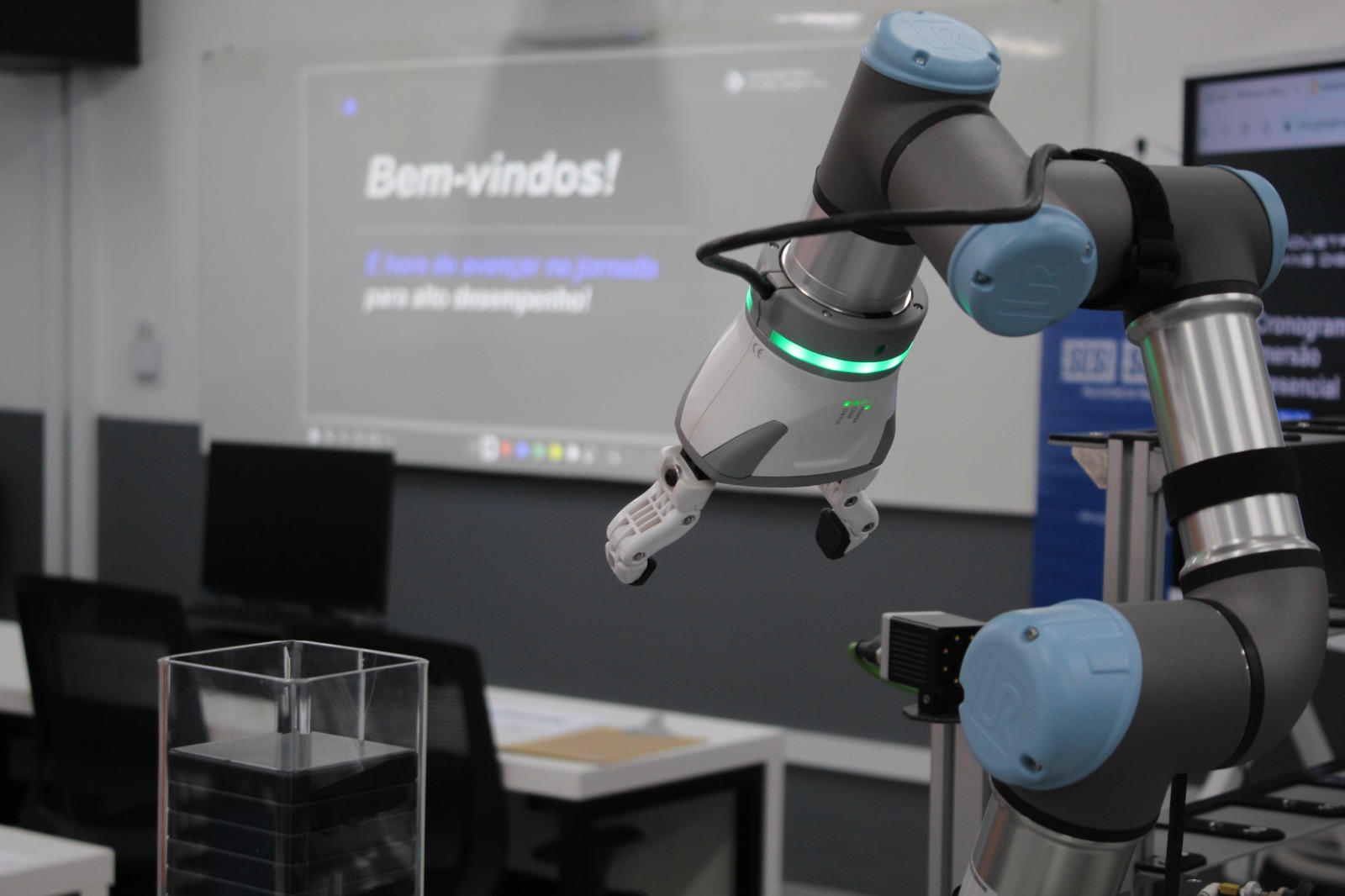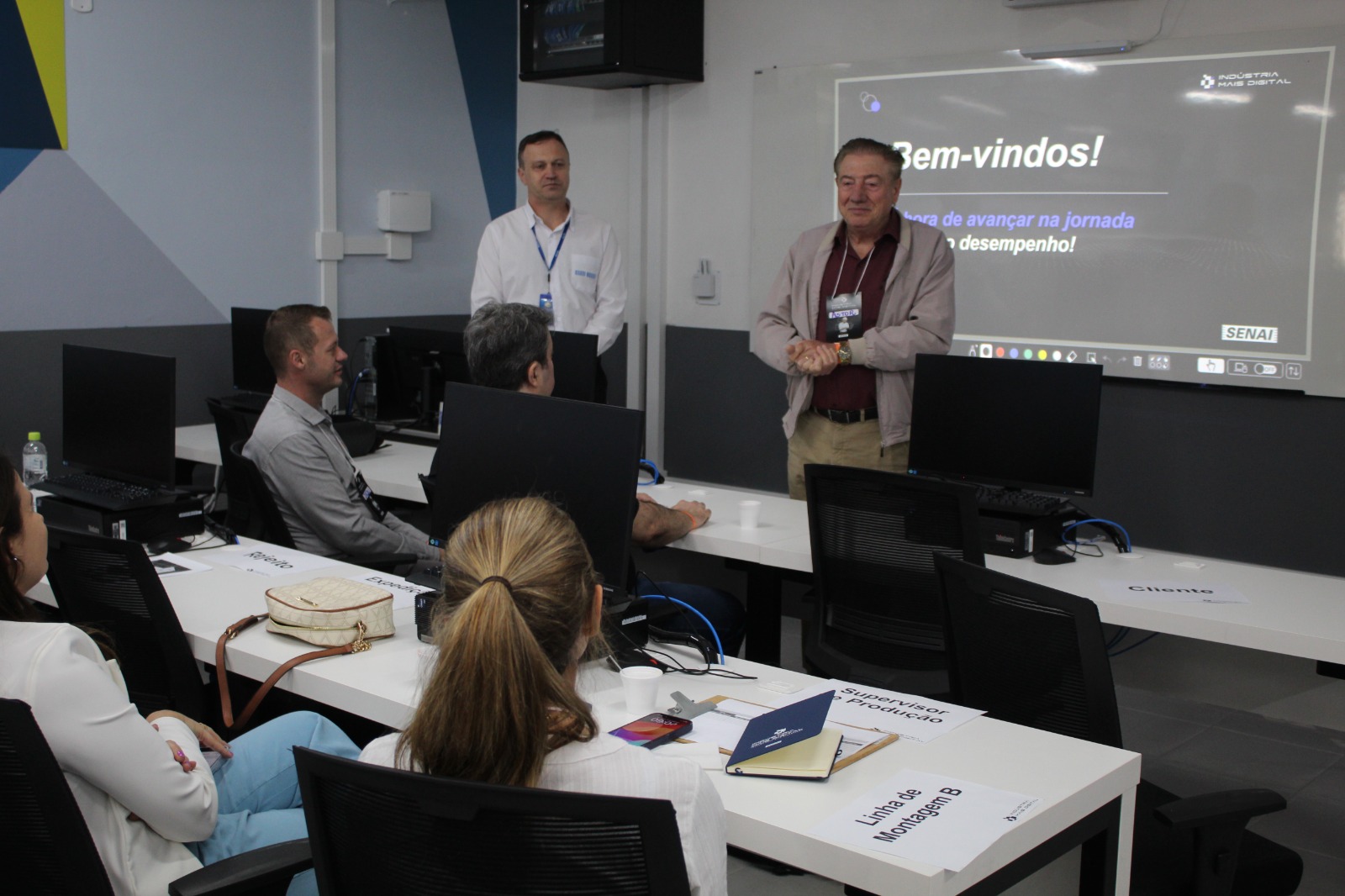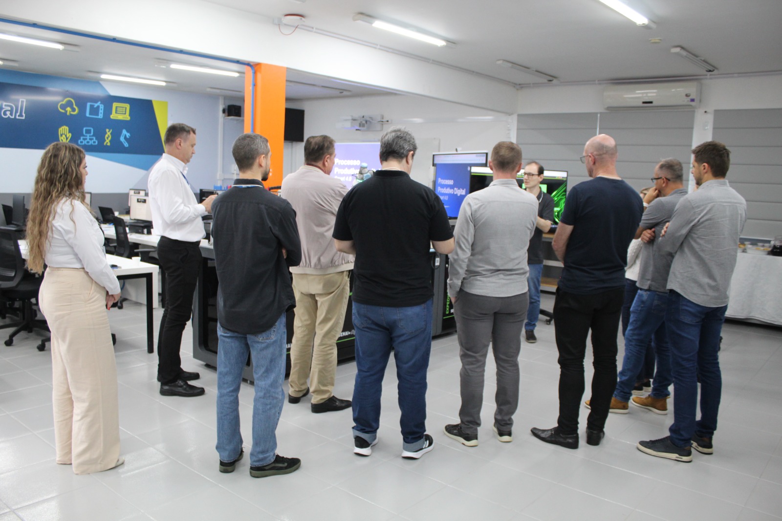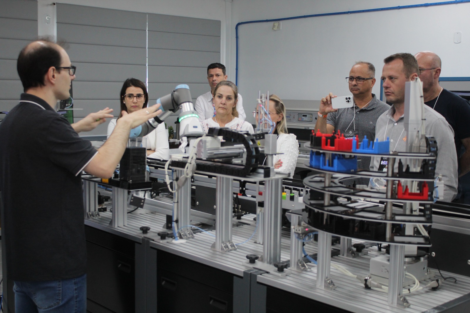 Em seguida, o instrutor do SENAI e engenheiro de automação industrial, João Carlos Giotto Júnior, proporcionou uma imersão prática com a Bancada 4.0, uma simulação do processo produtivo automatizado. A atividade permitiu que os participantes entendessem em detalhes o funcionamento dos sistemas automatizados e os benefícios que eles podem trazer em termos de produtividade e controle de qualidade.