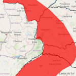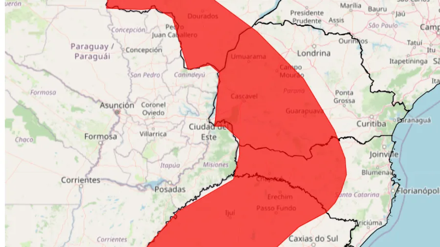 Regiões do Sul do país estão em alerta vermelho. Áreas como o oeste e o centro-oeste dos estados do Paraná, Santa Catarina e Rio Grande do Sul, além do sul de Mato Grosso do Sul, podem registrar chuva superior a 60 mm/h ou mais de 100 milímetros em um único dia. Há risco de danos em casas e prédios, queda de energia, estragos em plantações, alagamentos, queda de árvores e problemas no transporte por rodovias.