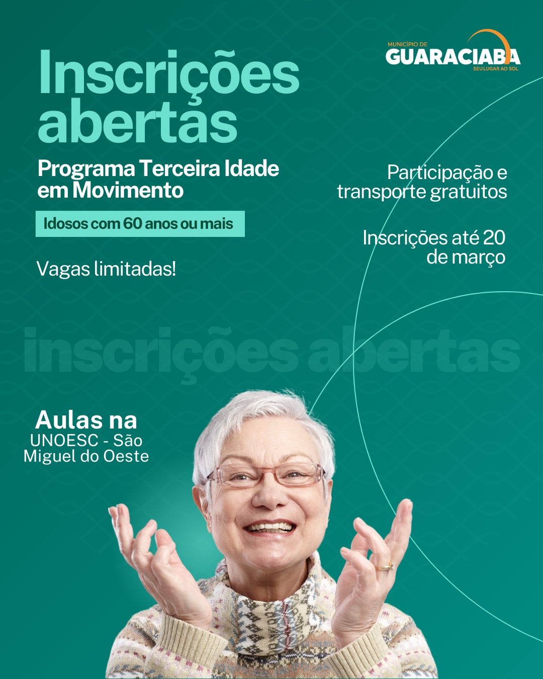 Última atualização: 2026/03/17 10:48:52Estão abertas em Guaraciaba as inscrições para o programa Terceira Idade em Movimento, iniciativa voltada para pessoas com 60 anos ou mais que desejam participar de atividades na UNOESC, em São Miguel do Oeste, a informação é da Secretária de Assistência Social Milena Balbinot.