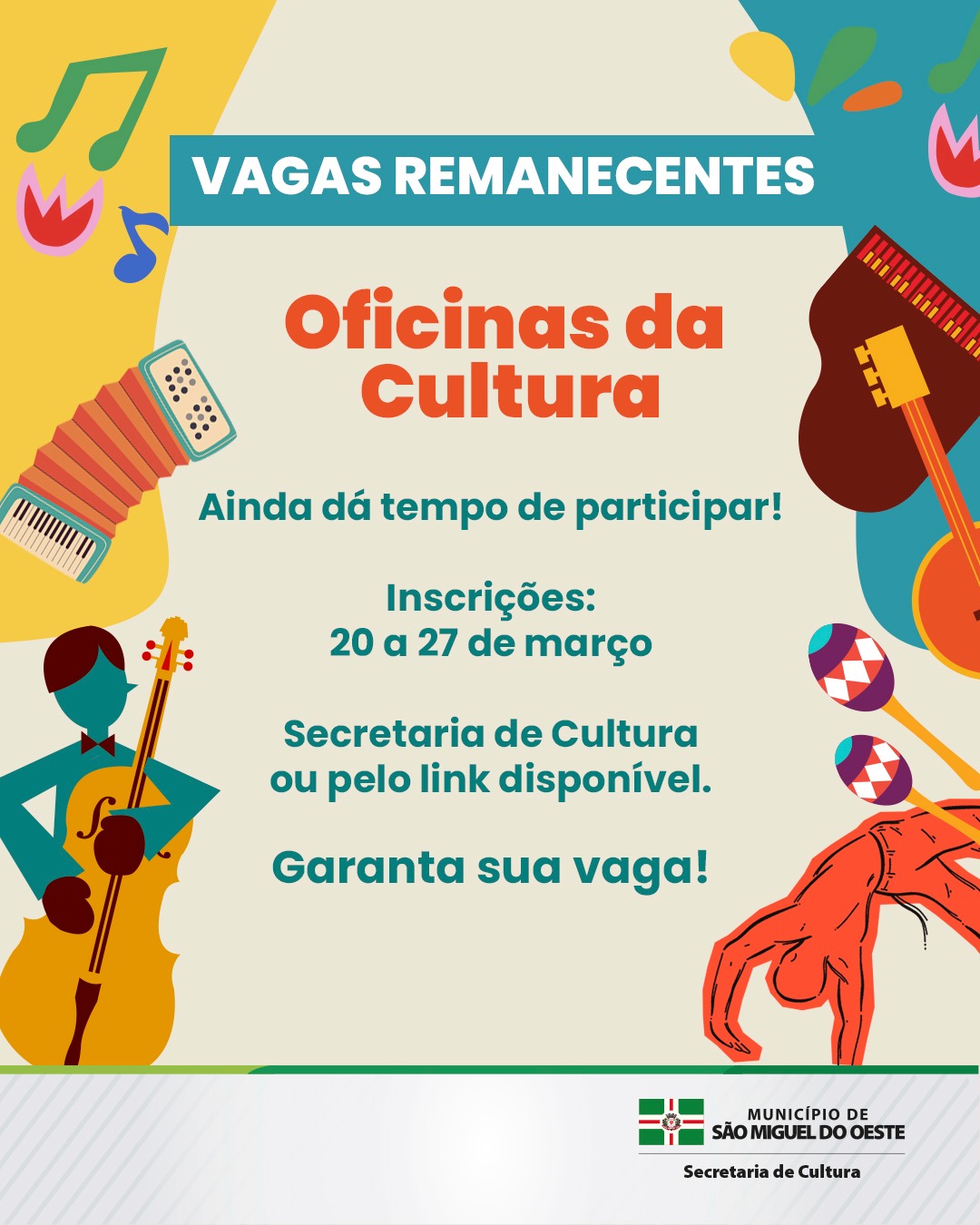 A Secretaria de Cultura de São Miguel do Oeste está com inscrições abertas para vagas remanescentes das Oficinas da Cultura 2026. O período de pré-inscrição segue de 20 a 27 de março .