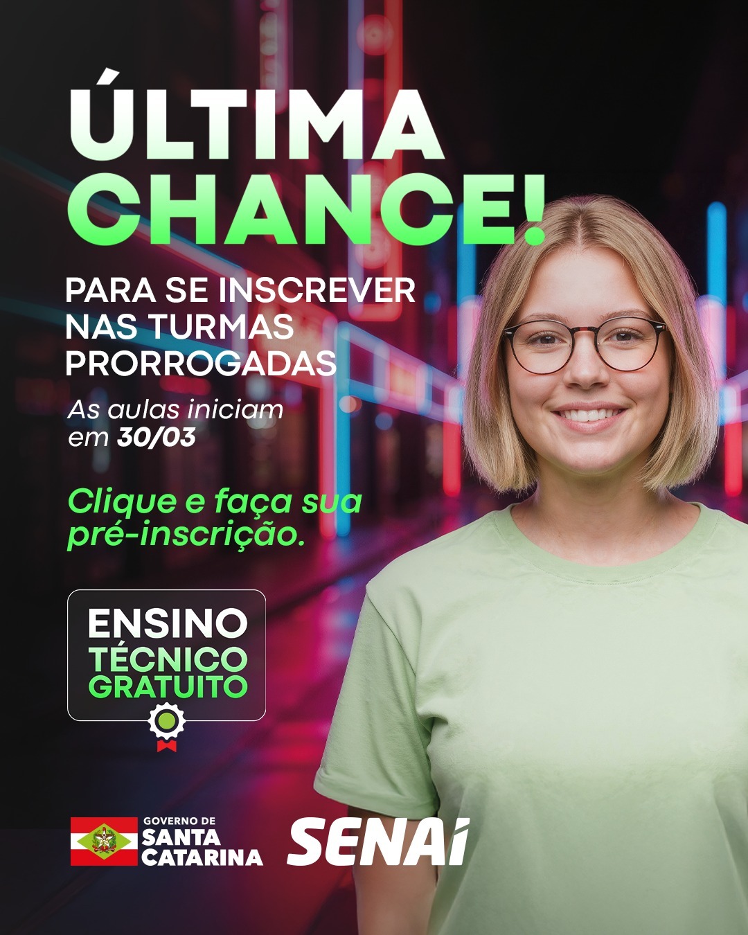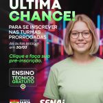 Última atualização: 2026/03/23 4:44:40Estudantes da 1ª e 2ª série do Ensino Médio da rede estadual ainda podem garantir vaga em cursos técnicos gratuitos ofertados pelo Governo do Estado, em parceria com o Senai, por meio do Ensino Técnico Gratuito. As inscrições foram prorrogadas para turmas em São Miguel do Oeste e Itapiranga, ampliando a oportunidade de qualificação profissional no Extremo-Oeste.