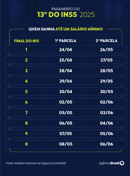 Última atualização: 2025/04/04 9:45:13A antecipação do décimo terceiro para aposentados, pensionistas e beneficiários de auxílios do Instituto Nacional do Seguro Social (INSS) injetará R$ 73,3 bilhões na economia, divulgou nesta quinta-feira (3) o Ministério da Previdência Social. O pagamento beneficiará 34,2 milhões de pessoas.