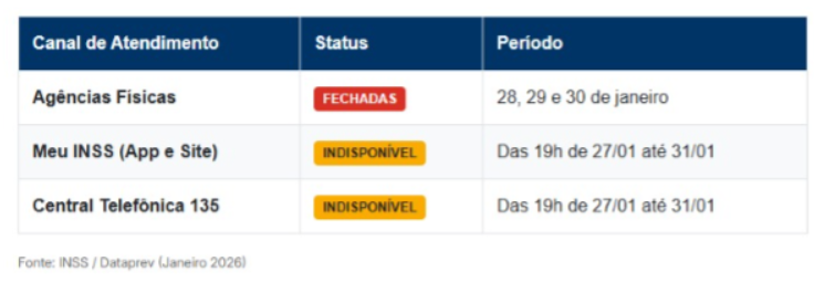 O Instituto Nacional do Seguro Social(INSS) confirmou que todas as agências da Previdência Social permanecerão fechadas para atendimento presencial nos dias 28, 29 e 30 de janeiro. A paralisação integra um processo de modernização em larga escala conduzido pela Dataprev, responsável pela infraestrutura tecnológica do órgão. Além das unidades físicas, haverá um apagão temporário nos canais digitais: o portal Meu INSS, no site e no aplicativo, e a Central Telefônica 135 ficarão indisponíveis a partir das 19h do dia 27, com previsão de retorno apenas em 31 de janeiro.