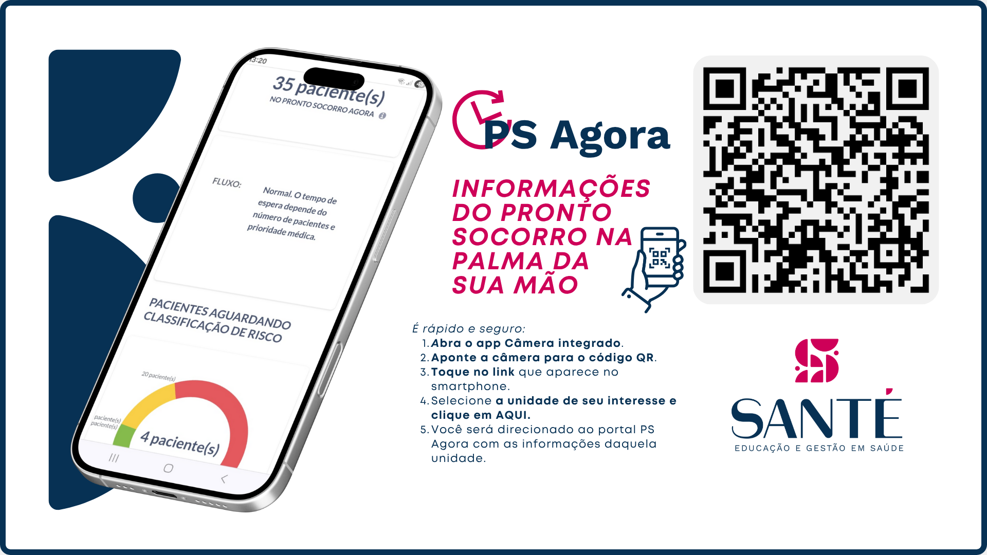 Para consultar a situação atual das unidades, basta acessar o site www.institutosante.com.br/psagora. A ferramenta pode ser usada diretamente pelo celular ou computador. O usuário seleciona a unidade hospitalar de interesse e, em seguida, é direcionado ao Portal PS Agora Santé, onde visualiza imediatamente o número de pacientes em atendimento.