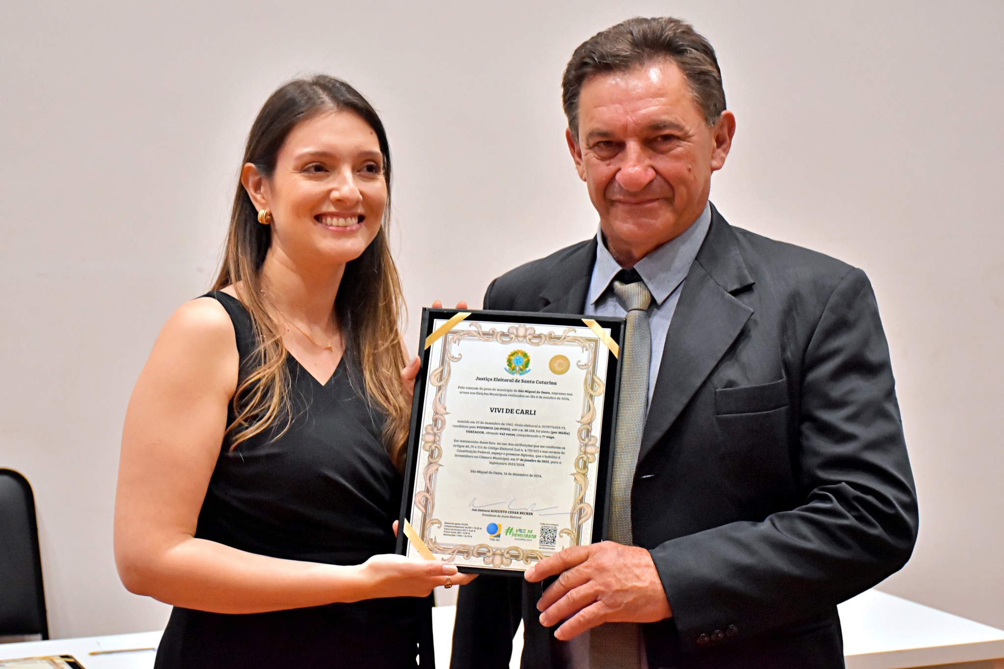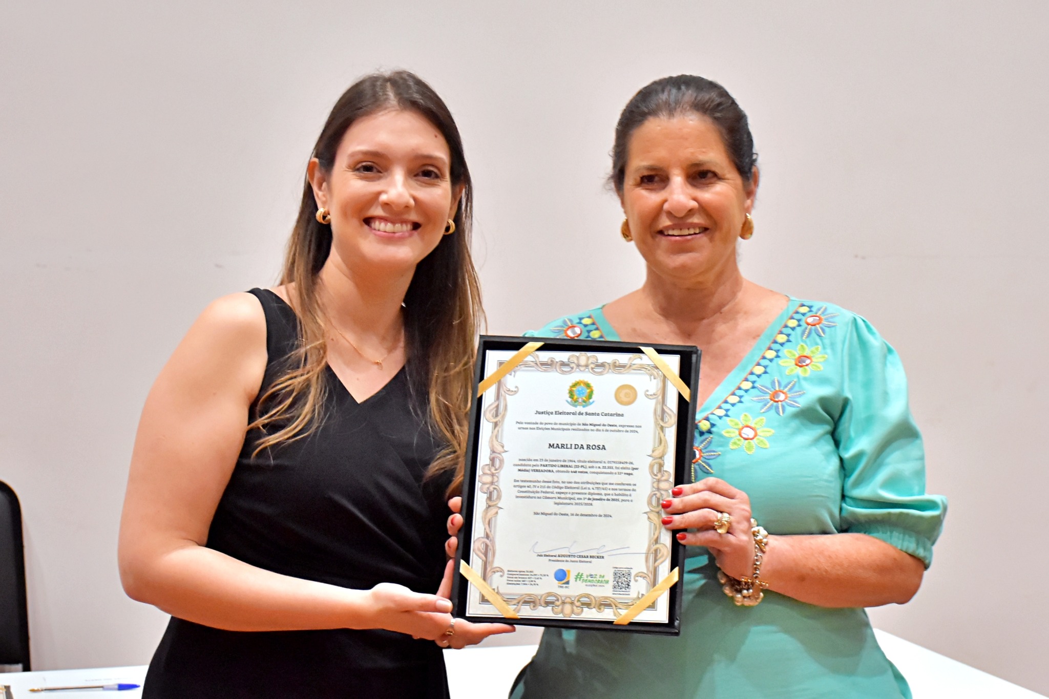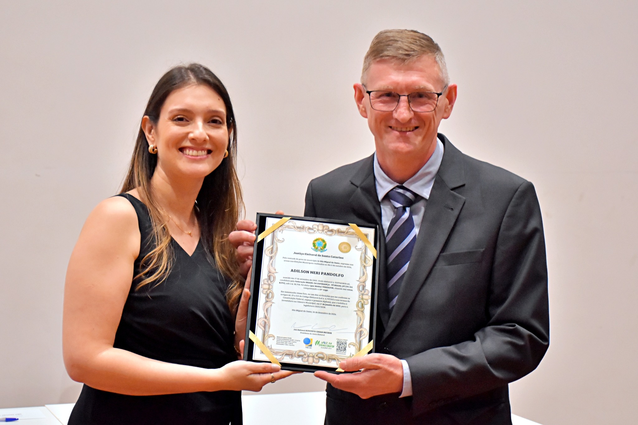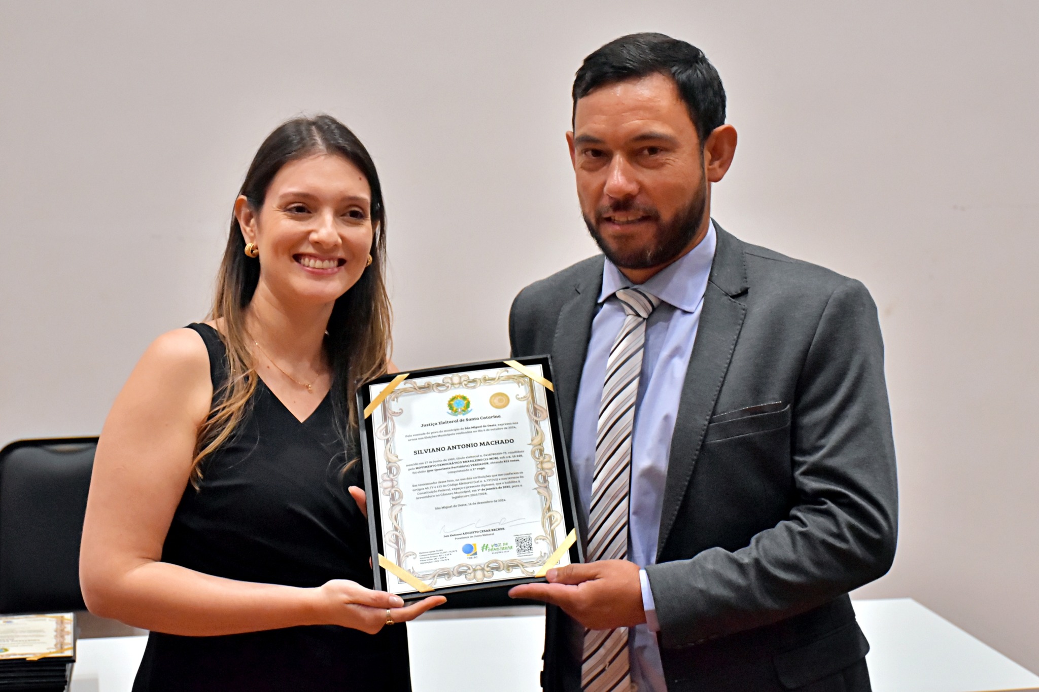 Última atualização: 2024/12/17 10:56:53Nesta segunda-feira (16), a Justiça Eleitoral realizou a cerimônia de diplomação dos vereadores, prefeitos e vice-prefeitos eleitos de São Miguel do Oeste. O evento marca a oficialização dos resultados das eleições municipais e confirma que os eleitos estão aptos a assumir os respectivos cargos.