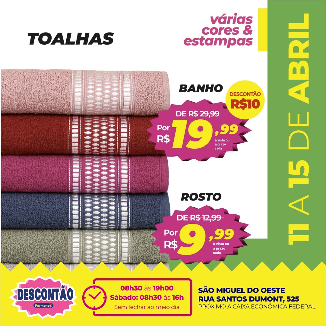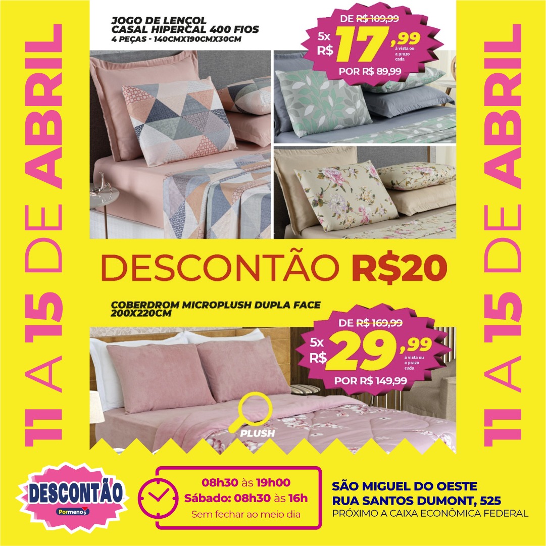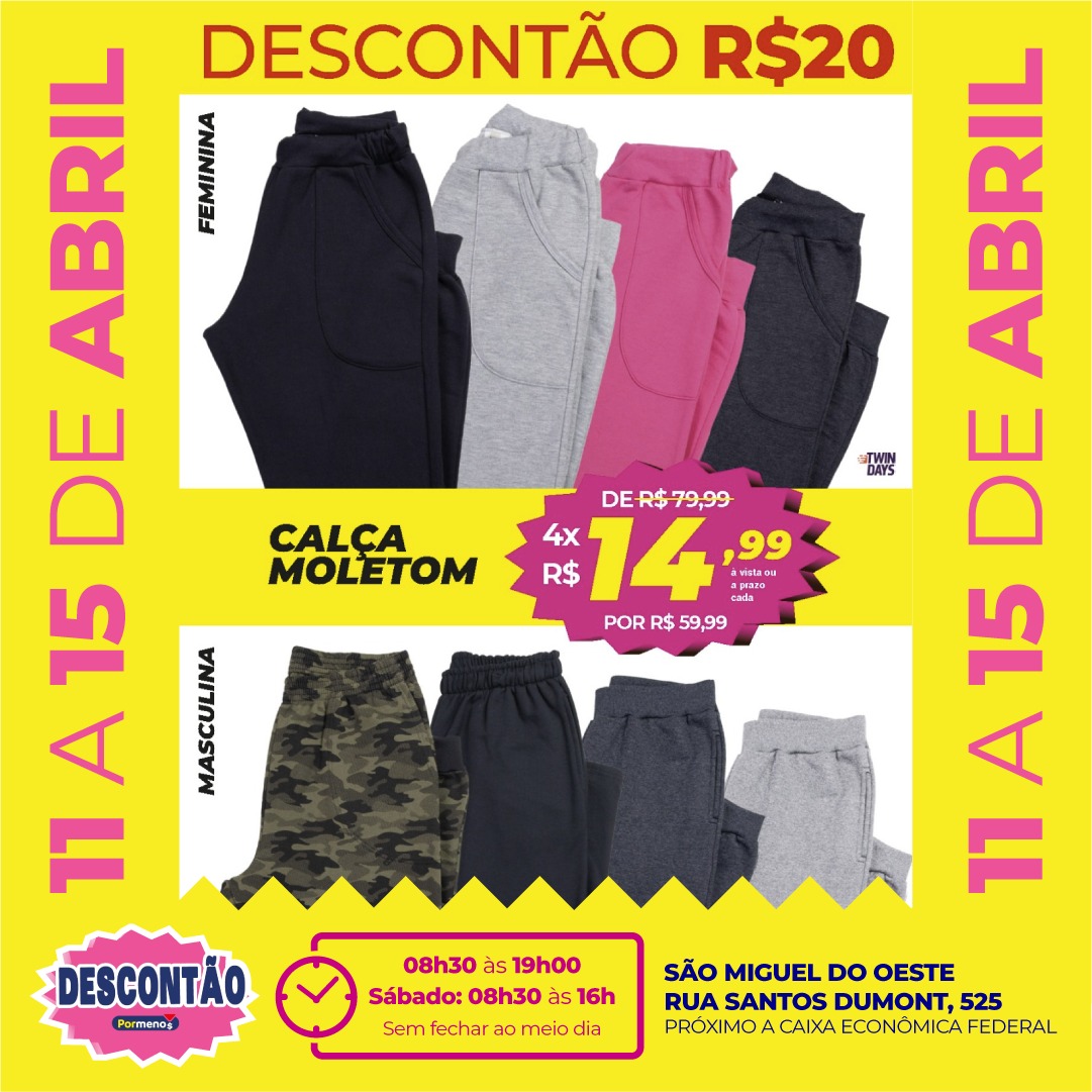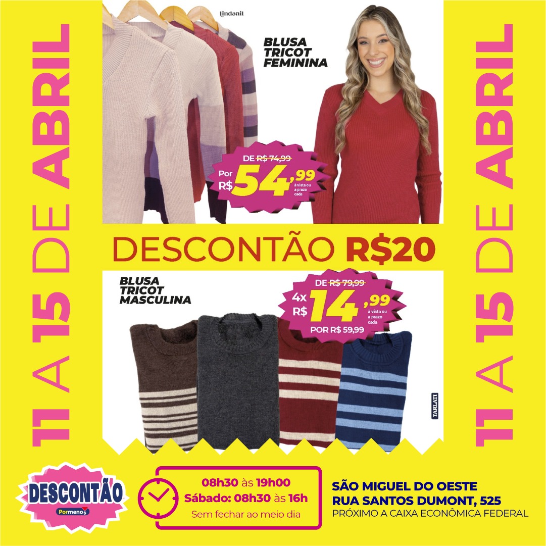 A rede de lojas Pormenos, do Grupo Grazziotin, está realizando nesta semana a maior campanha de desconto nas mais de 170 lojas físicas. A promoção “Descontão”, que acontece apenas três vezes por ano, iniciou nesta terça-feira (11), e segue até domingo (16). Em São Miguel do Oeste, a loja fica localizada na Rua Santos Dumont, N°519, no centro do município e não atende nos domingos, portanto, a promoção será válida até este sábado (15), até às 16h.