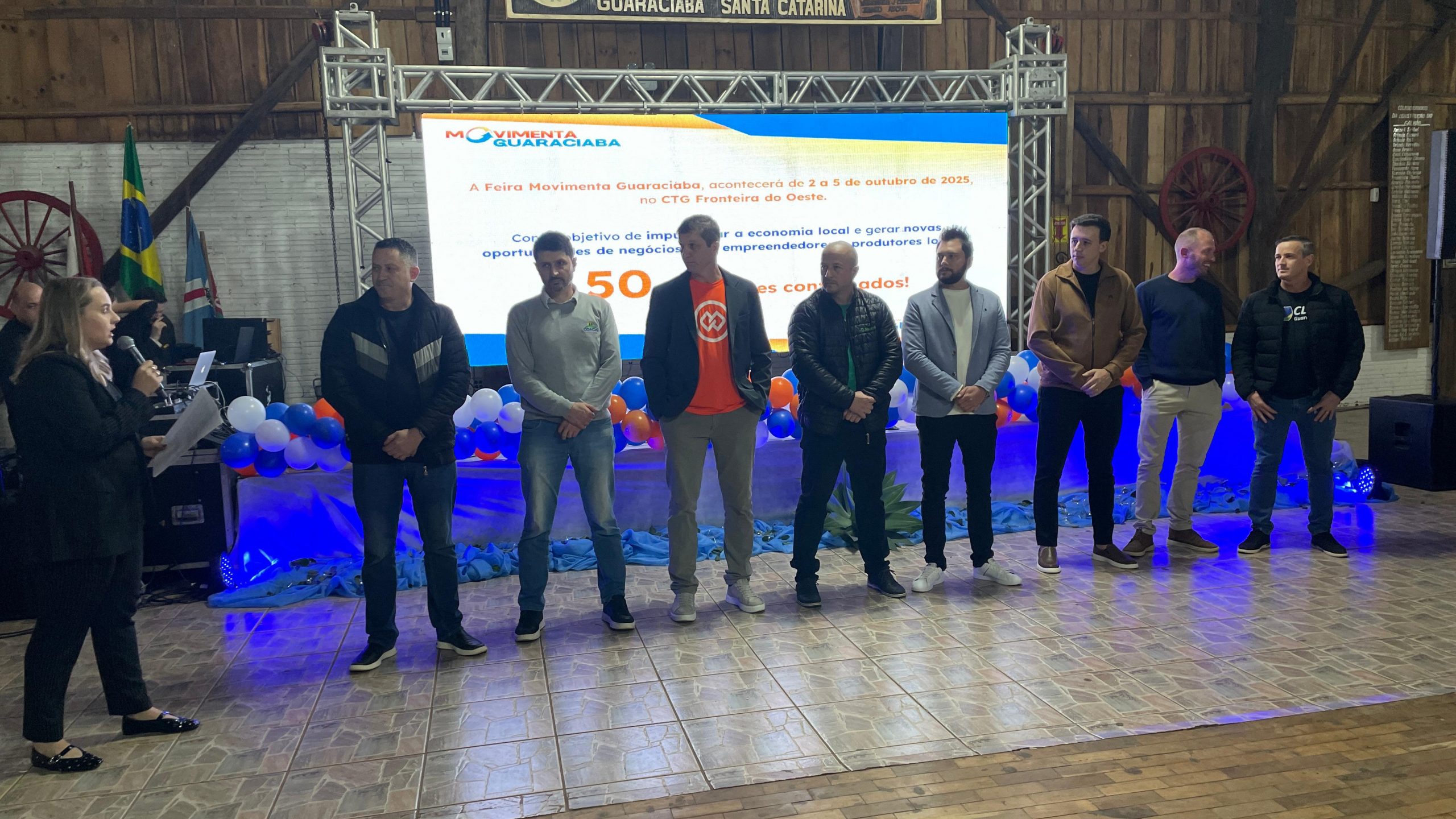 Última atualização: 2025/07/25 9:33:52A noite desta quinta-feira (24) marcou o lançamento oficial do “Movimenta Guaraciaba”, feira que ocorrerá de 2 a 5 de outubro com o propósito de fortalecer a economia local, valorizar empreendedores e promover cultura, gastronomia e entretenimento. O evento foi realizado no CTG Fronteira do Oeste, com casa lotada por autoridades, empresários, patrocinadores e representantes da comunidade.