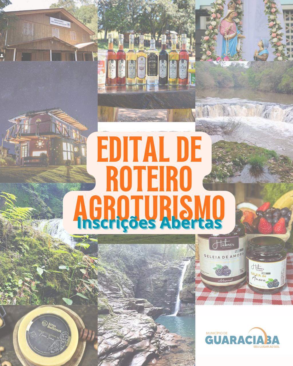 Última atualização: 2025/10/20 11:34:46A Administração Municipal de Guaraciaba através da Secretaria de Indústria, Comércio, Turismo e Desenvolvimento comunica que está aberto um Edital de Chamamento Público Nº 17/2025 para seleção de empresas e produtores rurais para integração à rota de Agroturismo do Município. As inscrições estão abertas no período de 20 a 31 de outubro e a atividade é realizada também através do SEBRAE.