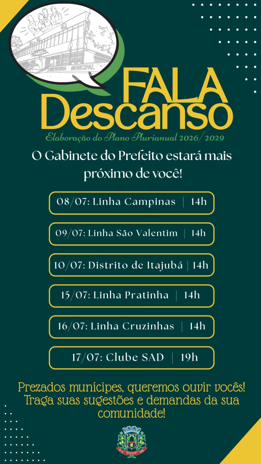 Última atualização: 2025/07/02 4:45:30A Prefeitura de Descanso instituiu oficialmente o programa “Fala Descanso”, uma iniciativa voltada à escuta ativa da população urbana e rural com o objetivo de subsidiar a construção participativa dos principais instrumentos de planejamento orçamentário do município: o Plano Plurianual (PPA), a Lei de Diretrizes Orçamentárias (LDO) e a Lei Orçamentária Anual (LOA).