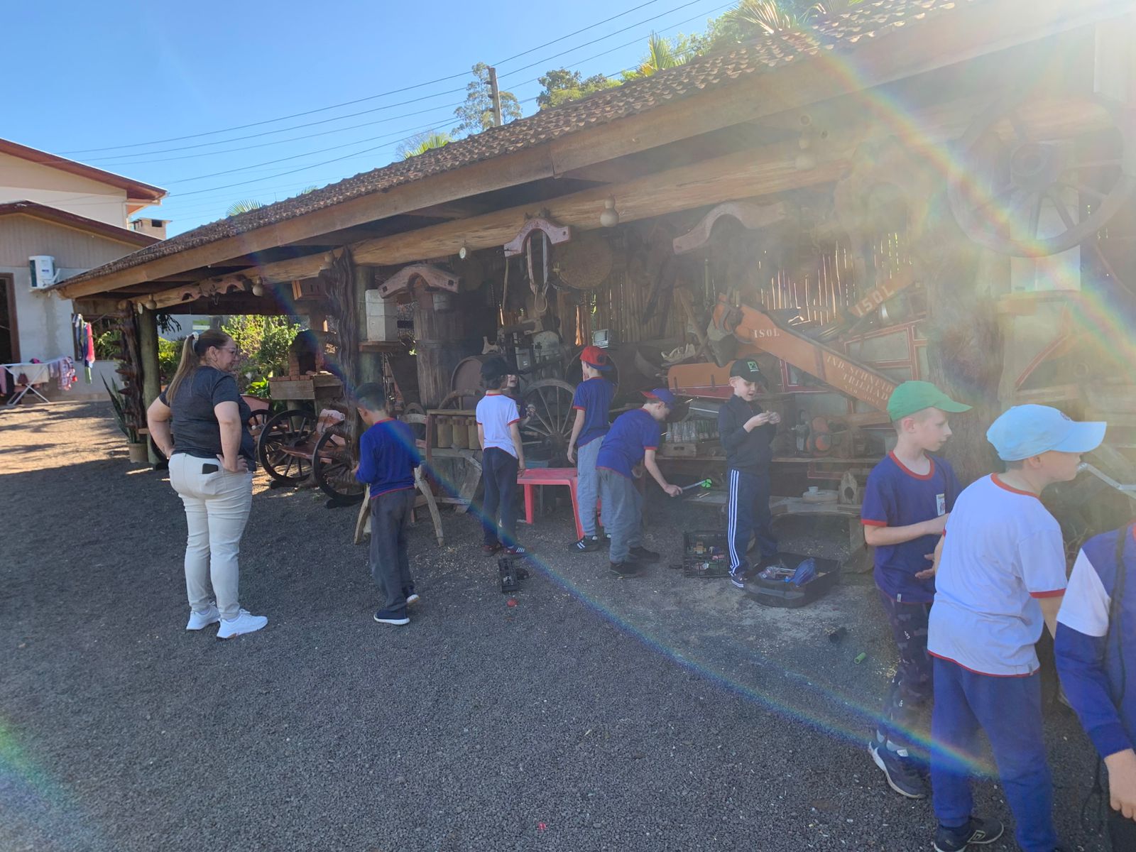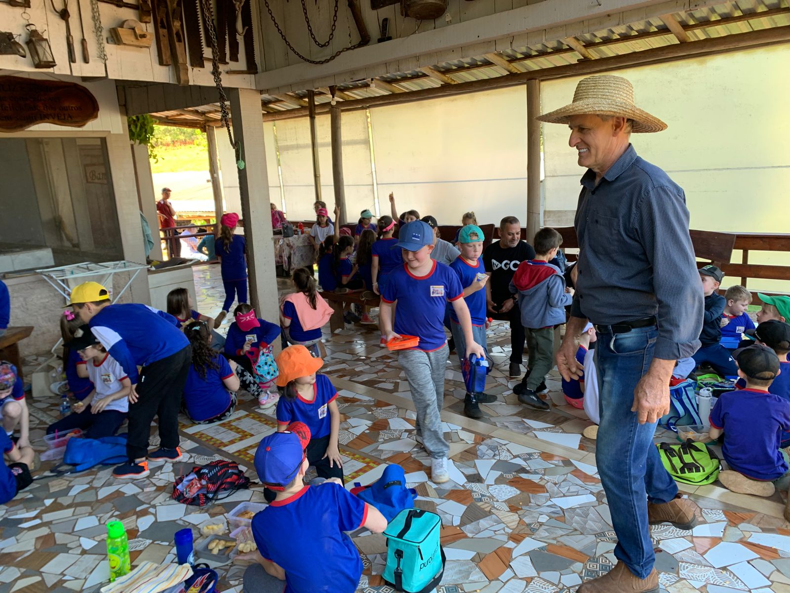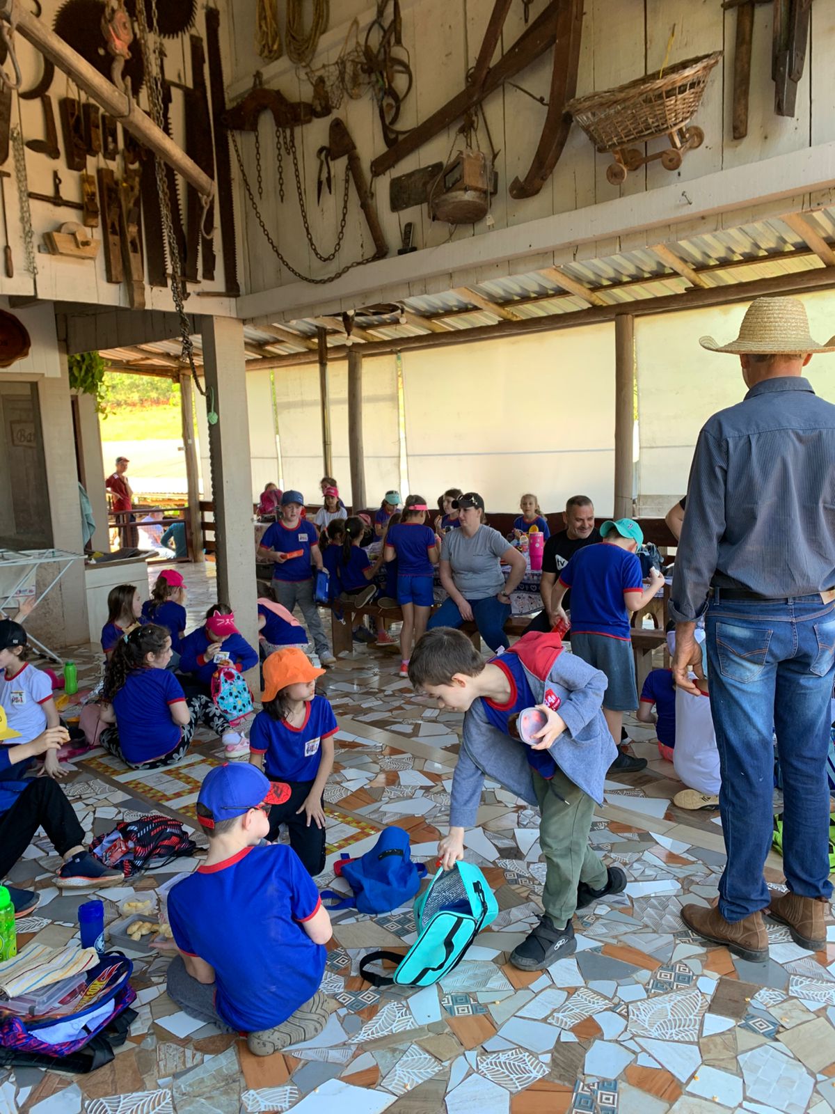 Alunos da Escola Emma Balk exploraram a vida no campo e conheceram ferramentas centenárias na propriedade do casal Orso