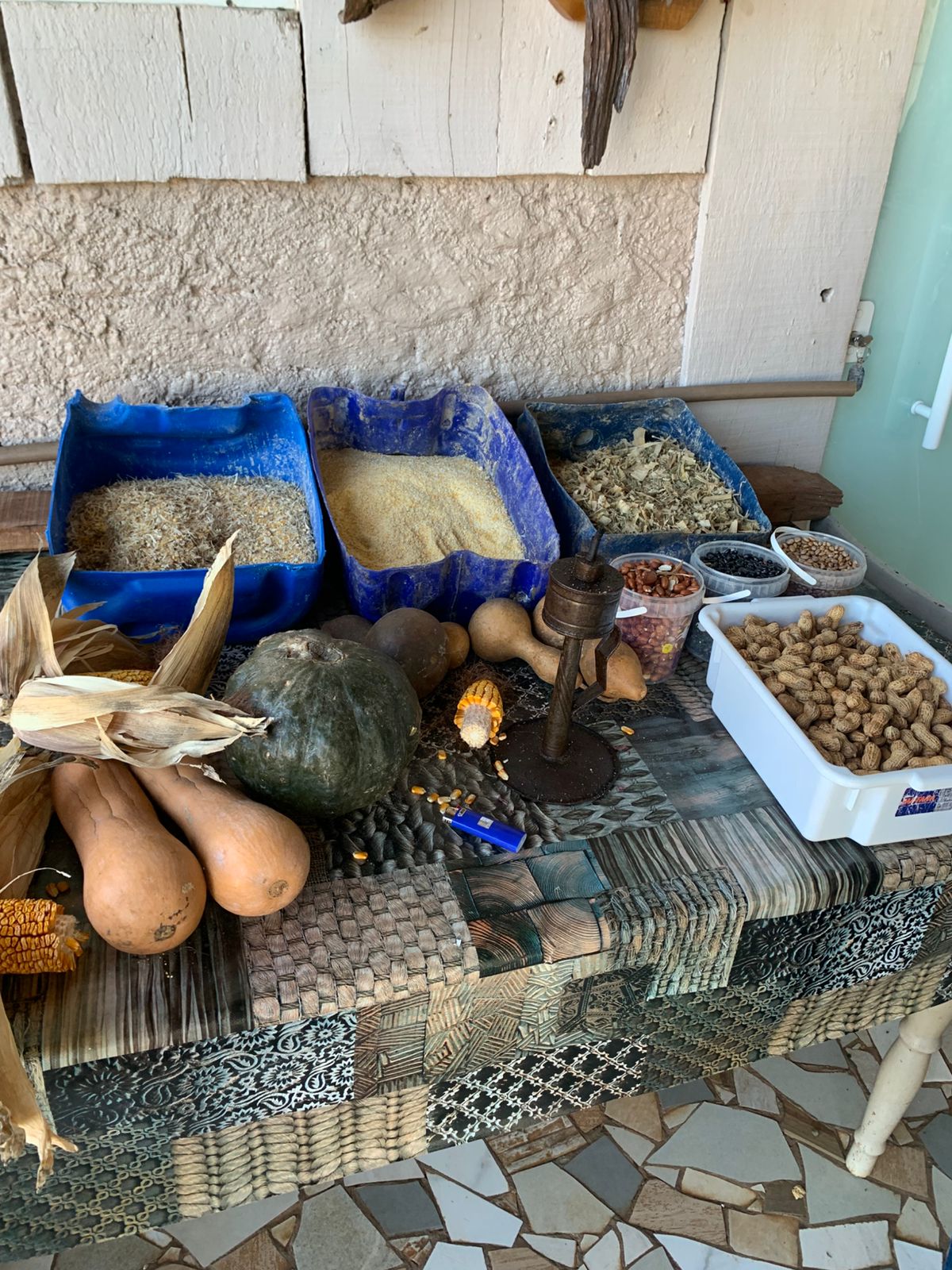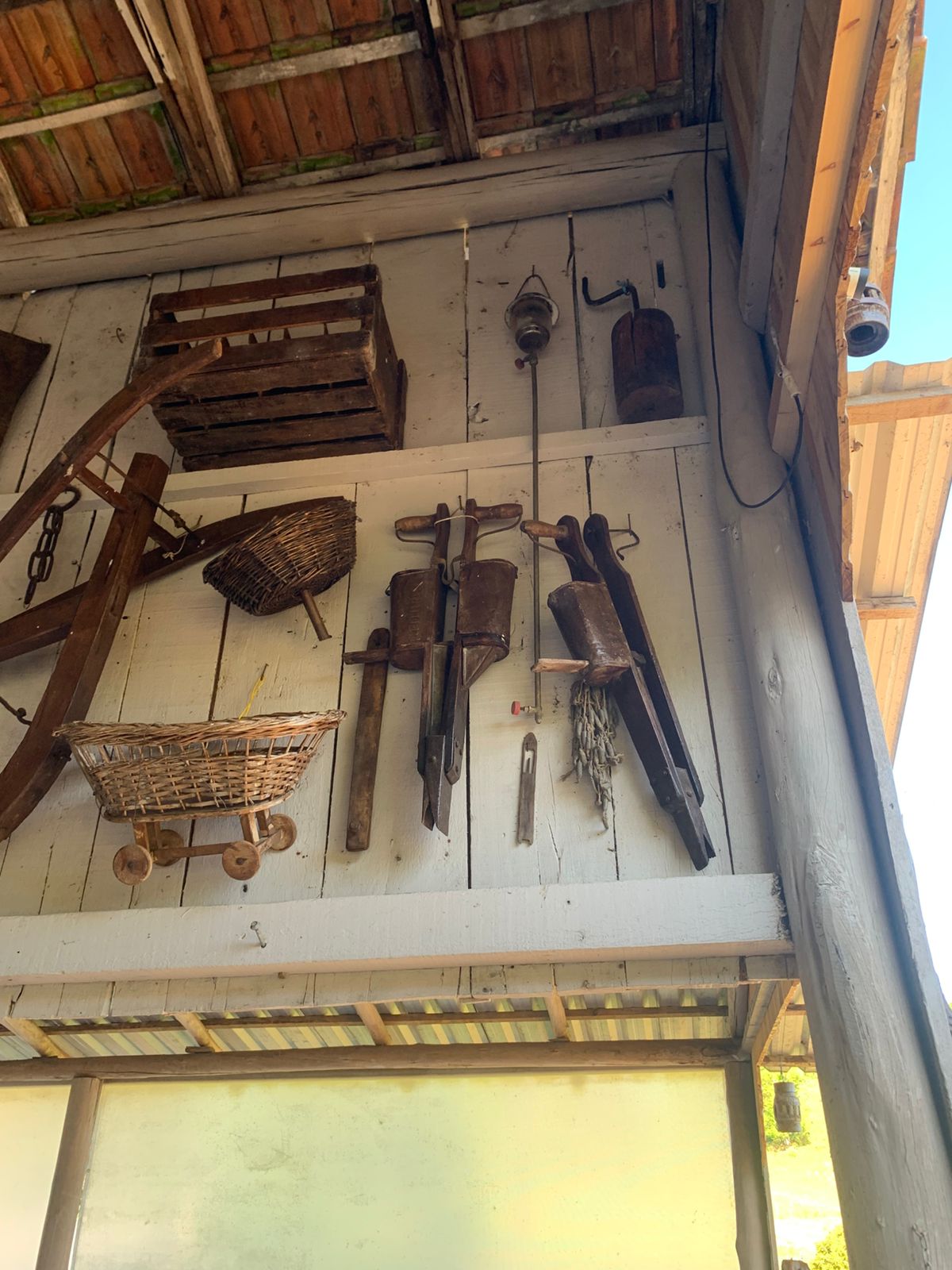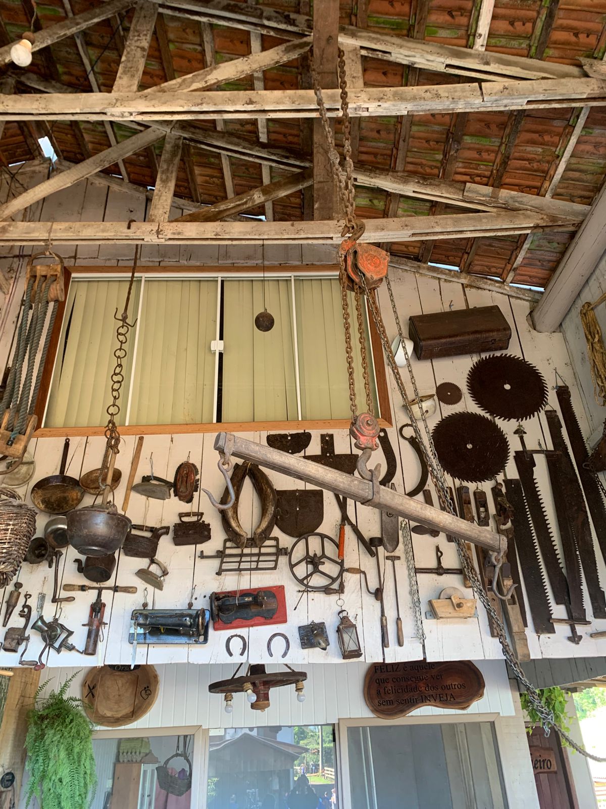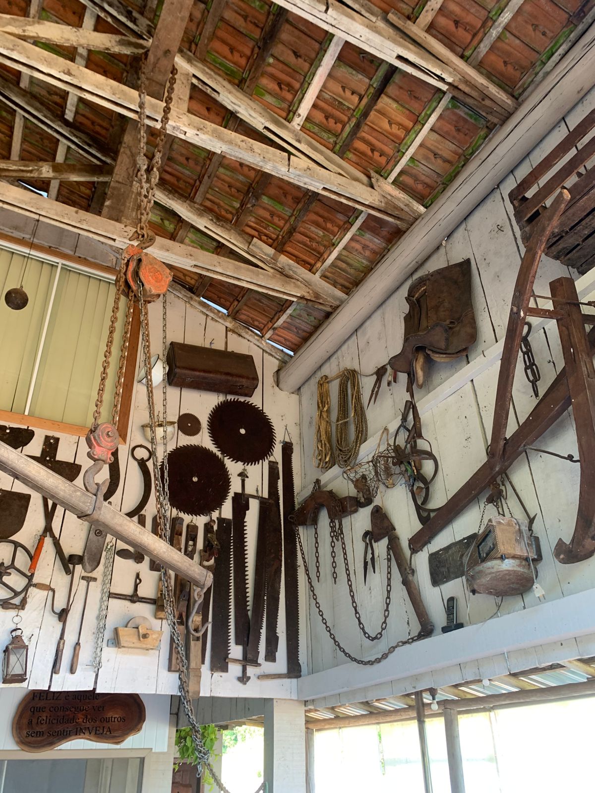 Um dos momentos mais marcantes foi a visita ao mini-museu de antiguidades rurais mantido por Antônio, que reúne peças coletadas e doadas ao longo dos anos. Entre os destaques estão ferramentas de plantio manual conhecidas como “pica-pau”, arados antigos, moinhos de quirela, trilhadeiras, incluindo uma ainda em funcionamento, além de aparelhos raros como um pulverizador de parreira de madeira com 155 anos, máquinas de costura e datilografia, forno de barro, máquina de fazer macarrão e a “gangália”, usada para transporte de milho com cavalos. Seu Orso explicou a função e a história de cada item, preservando a memória do trabalho rural de outras épocas.