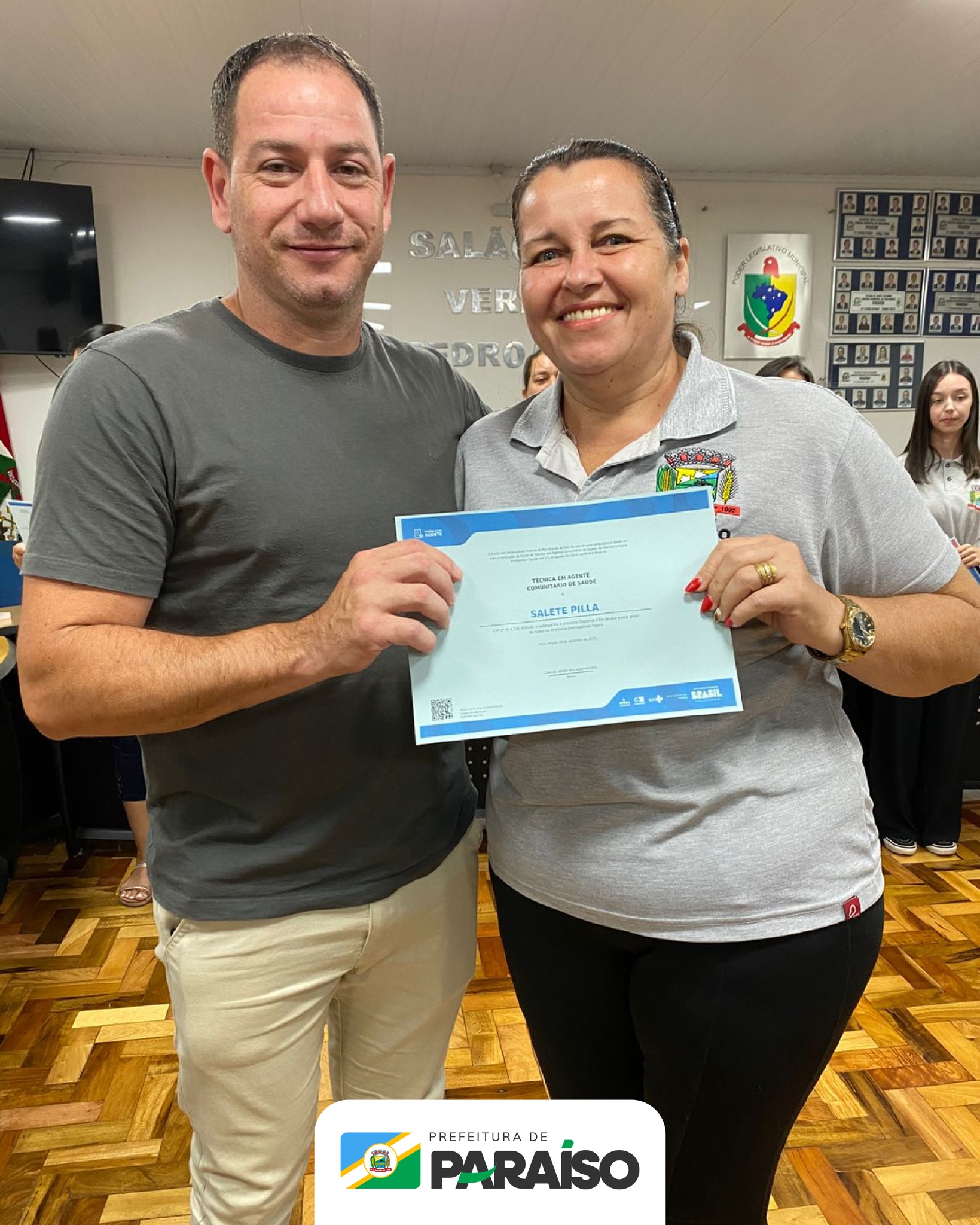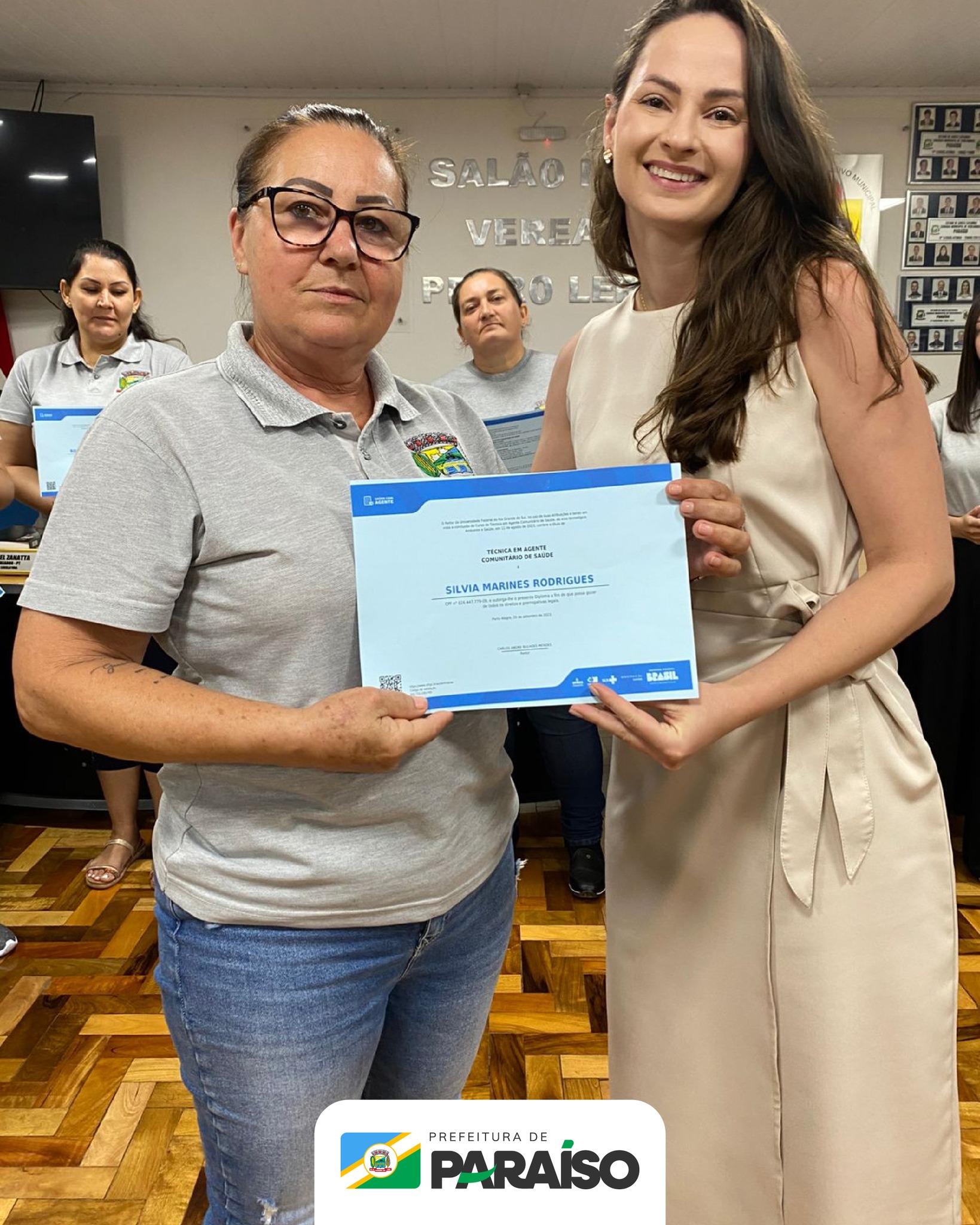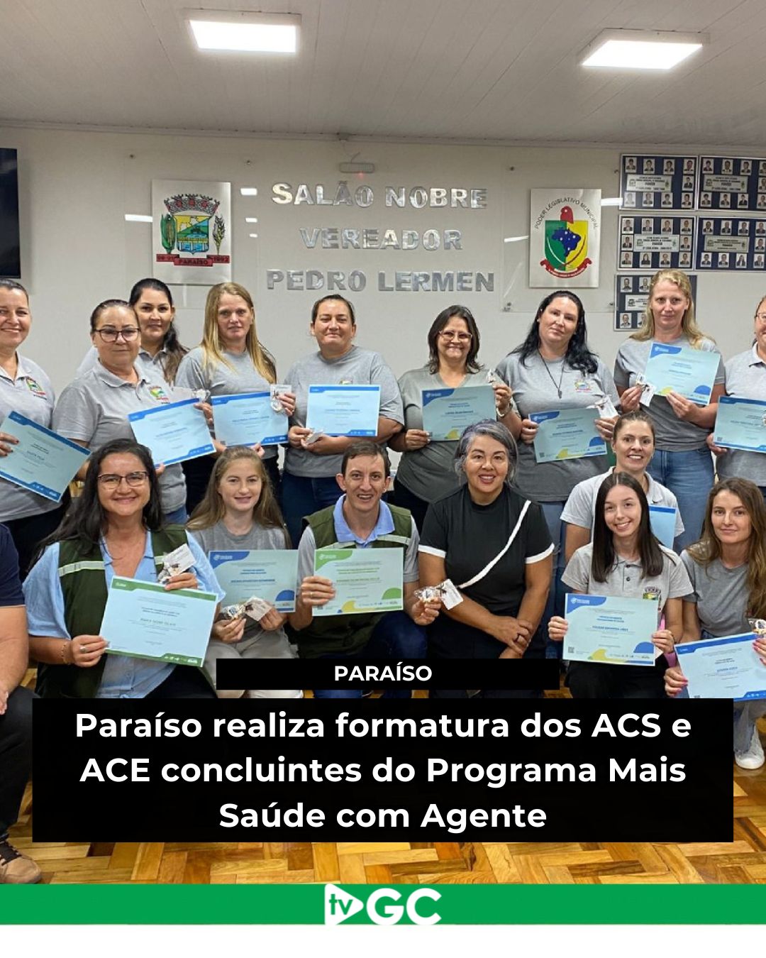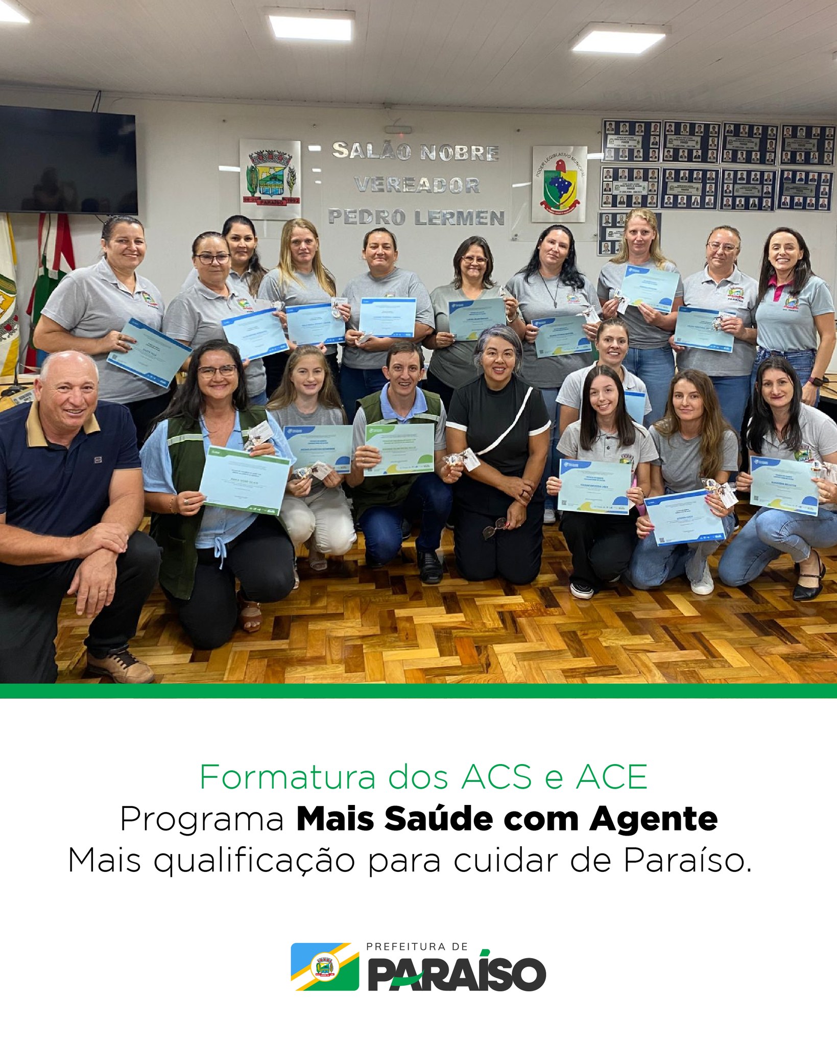O Município de Paraíso realizou nesta última sexta-feira (20/02) a formatura dos Agentes Comunitários de Saúde (ACS) e Agentes de Combate às Endemias (ACE) concluintes do Programa Mais Saúde com Agente, instituído pelo Ministério da Saúde por meio da Portaria GM/MS nº 2.304/2023, desenvolvido em parceria com o Conselho Nacional de Secretarias Municipais de Saúde (CONASEMS) e a Universidade Federal do Rio Grande do Sul (UFRGS).