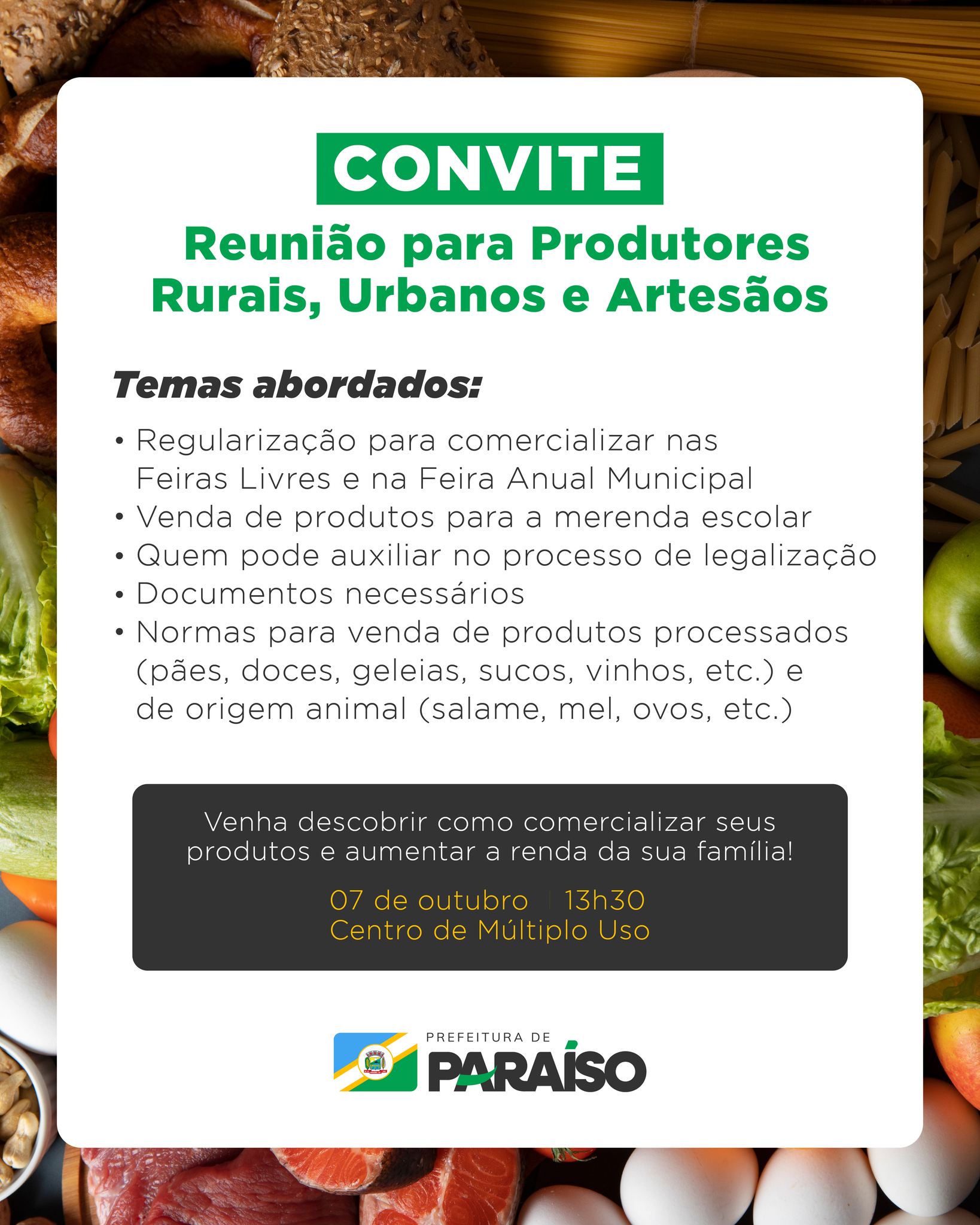 Última atualização: 2025/09/24 7:30:01A Prefeitura de Paraíso convida produtores rurais, produtores urbanos e artesãos para uma reunião especial no dia 07 de outubro, às 13h30, no Centro de Múltiplo Uso.