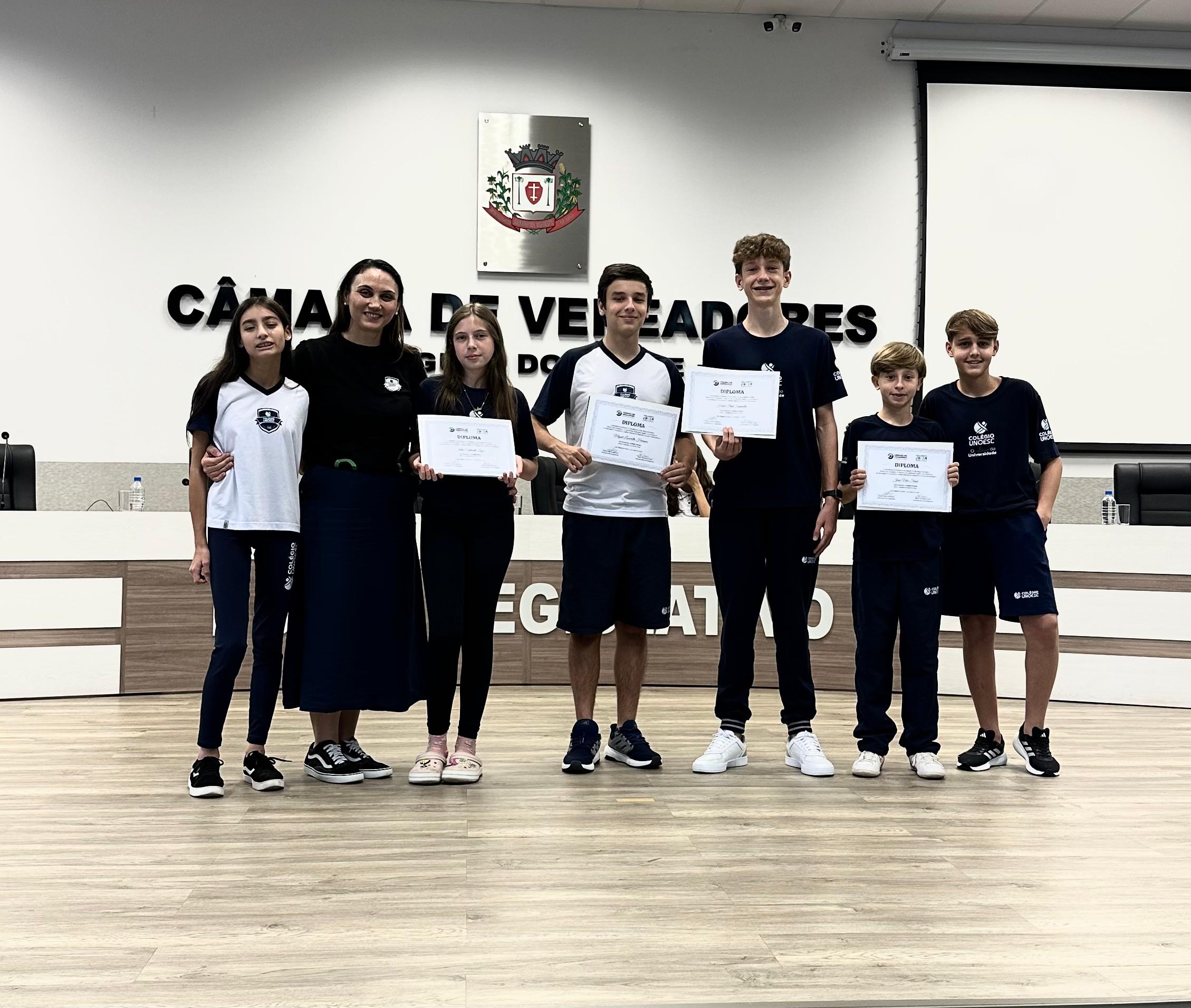 Eleito presidente, o estudante Heitor Puhl Somavilla, representante do Colégio Unoesc, assume a condução dos trabalhos ao lado da vice-presidente Jennifer Laís Zambiazi, da primeira-secretária Yara Helena Follmann Maciel e do segundo-secretário Enzo Matheo Pian da Silva, destacando que sua trajetória começou com incentivo escolar e que o resultado foi fruto de dedicação coletiva, afirmando que “eu não necessariamente esperava, mas eu gostaria muito que eu tivesse sido presidente, e com o meu esforço, com a ajuda dos outros candidatos, eu consegui me eleger”, além de já indicar pautas como mobilidade urbana e regulamentação de veículos elétricos.