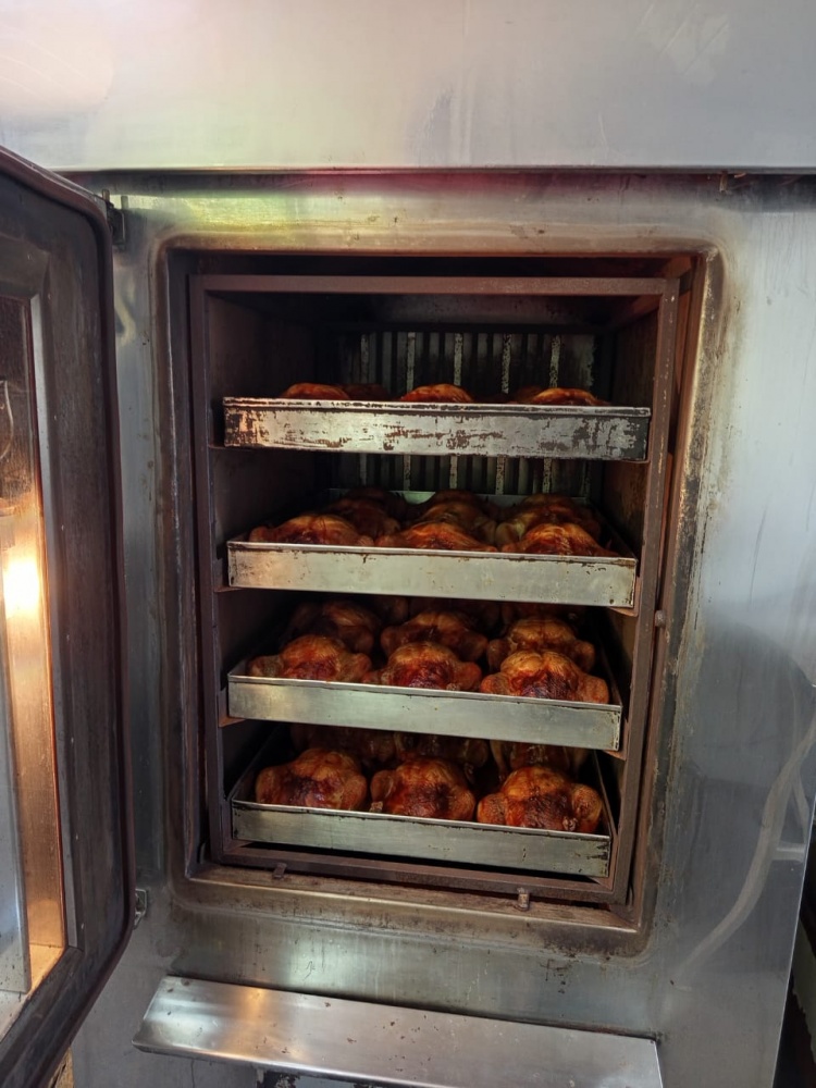 O almoço, servido ao meio-dia, contou com frangos recheados, churrascos de gado e suíno e acompanhamentos preparados pela comunidade