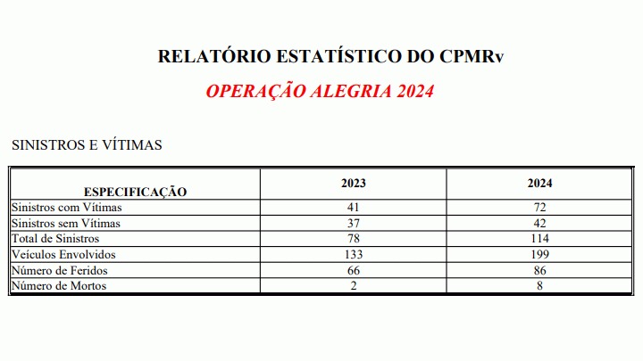 Ao todo, foram registrados 114 sinistros, em comparação aos 78 contabilizados na operação passada. Destes, 72 foram com vítimas e 42 sem vítimas. Os números apontam 199 veículos envolvidos, em comparação aos 133 do ano anterior e 86 pessoas feridas, contra 66 do ano de 2023. Infelizmente oito pessoas morreram nas rodovias estaduais de Santa Catarina.