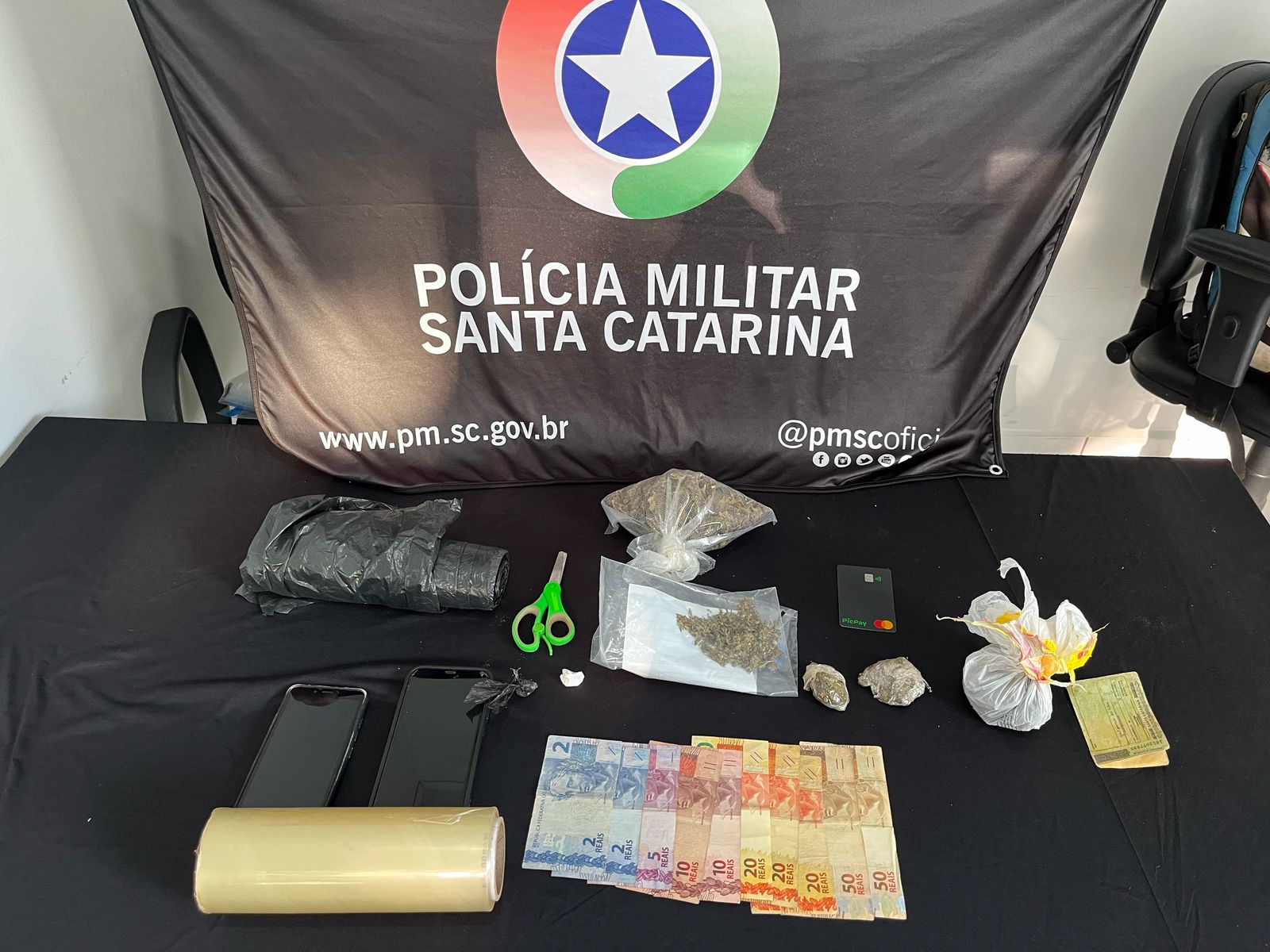 Um aparelho celular LG e uma CNH pertencente a um homem com residência em Florianópolis-SC, que possui antecedentes por tráfico de drogas.