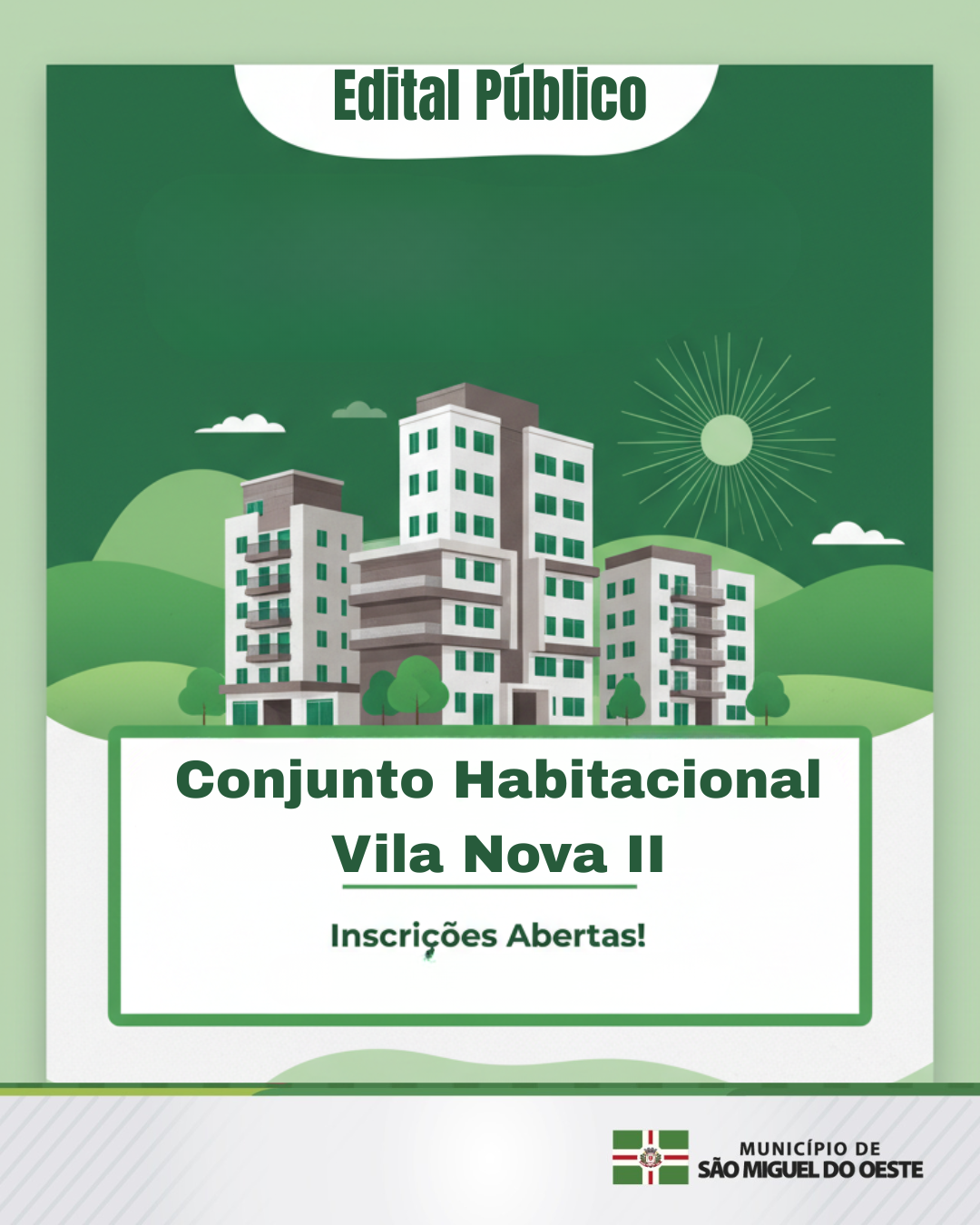 Última atualização: 2025/11/06 2:11:12A Prefeitura de São Miguel do Oeste, por meio do Departamento de Habitação e Regularização Fundiária, lançou o Edital de Chamamento Público nº 001/2025 para a seleção de famílias interessadas nas unidades habitacionais do Conjunto Vila Nova II, localizado no bairro São Luiz.