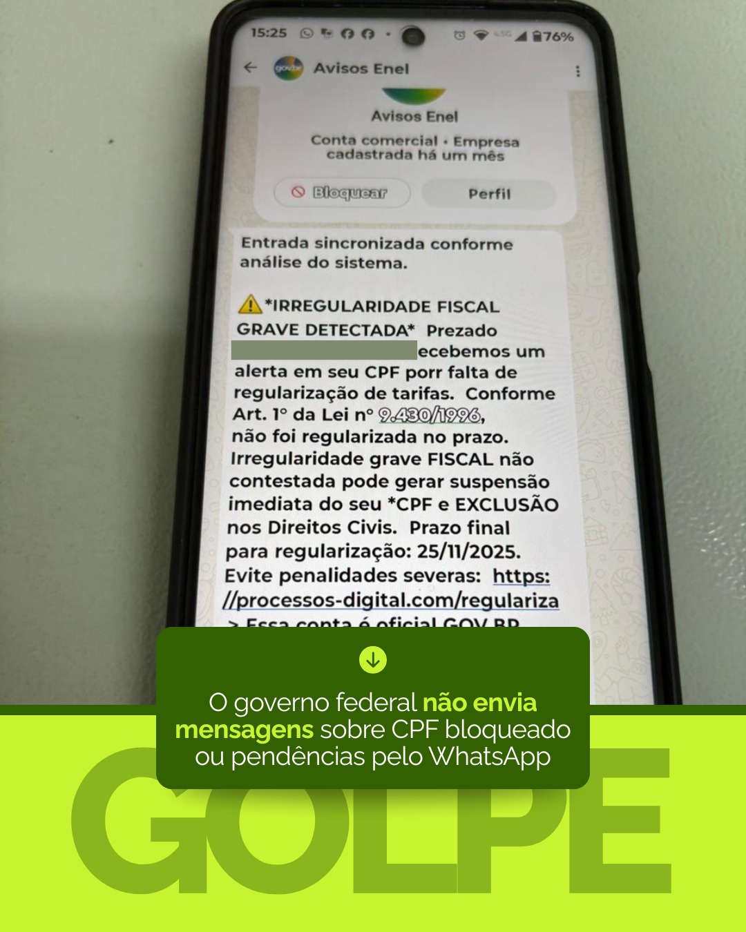 O governo federal não envia mensagens sobre CPF bloqueado ou pendências pelo WhatsApp. Consultas oficiais devem ser feitas apenas pelo aplicativo ou site GOV.BR e pela Receita Federal.