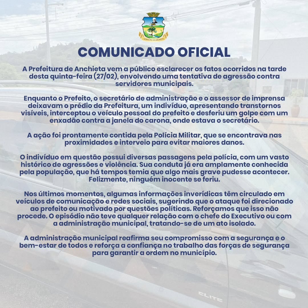 Última atualização: 2025/02/28 2:30:32A Prefeitura de Anchieta emitiu um comunicado oficial nesta quinta-feira (27/02) para esclarecer os fatos envolvendo uma tentativa de agressão contra servidores municipais. O incidente ocorreu na saída do prédio da Prefeitura, quando o prefeito, o secretário de administração e o assessor de imprensa foram abordados por um indivíduo em aparente estado de transtorno.