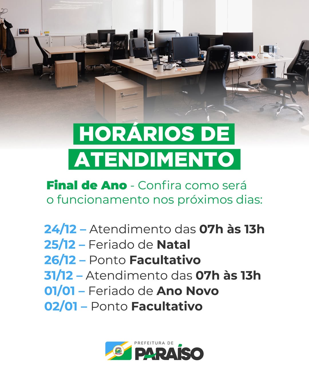 Home Prefeitura de Paraíso divulga horários especiais de atendimento no fim de ano