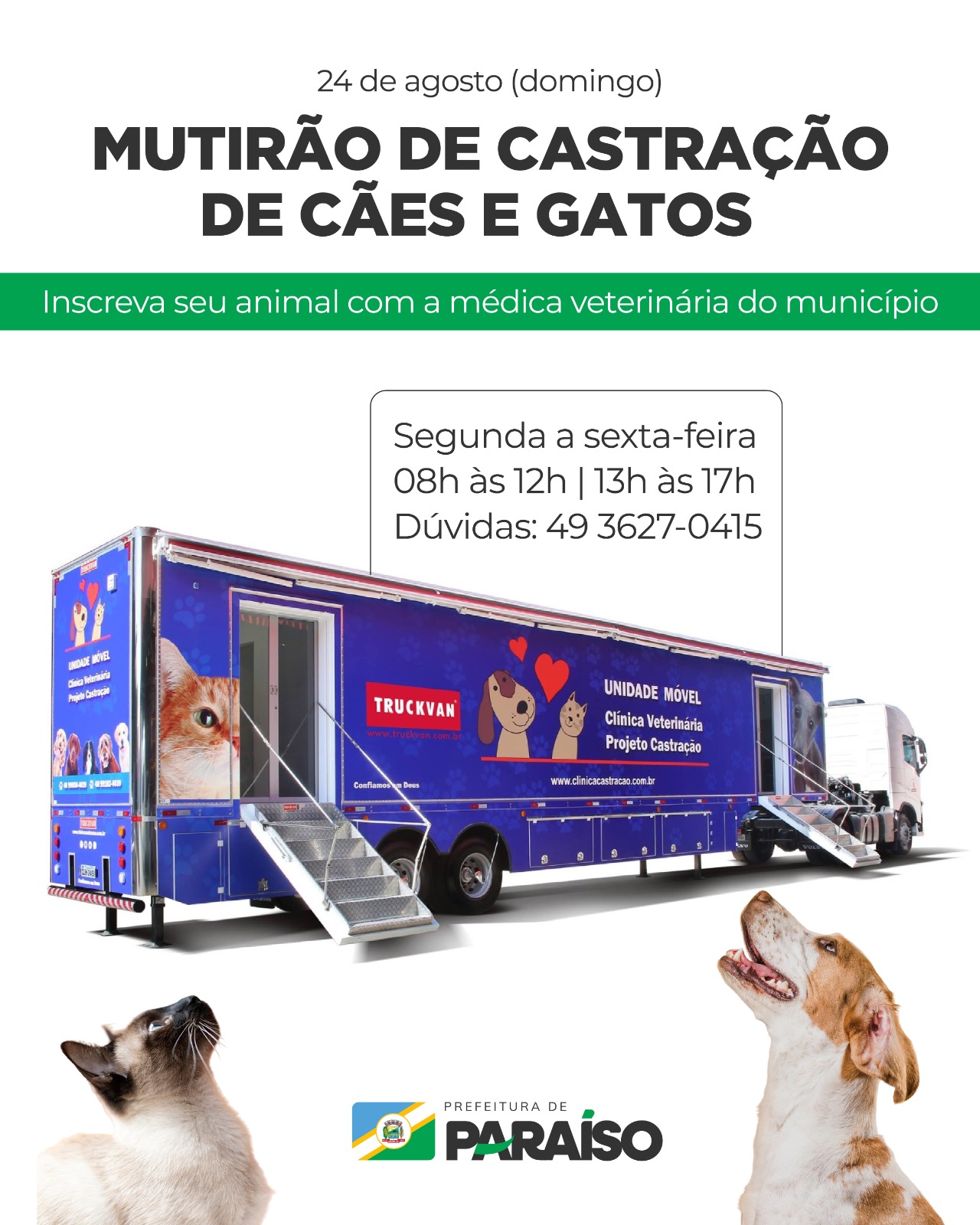 A Prefeitura de Paraíso realizará no domingo, 24 de agosto, um Mutirão de Castração de Cães e Gatos. A ação tem como objetivo promover a saúde dos animais e colaborar com o controle populacional de cães e gatos na cidade.