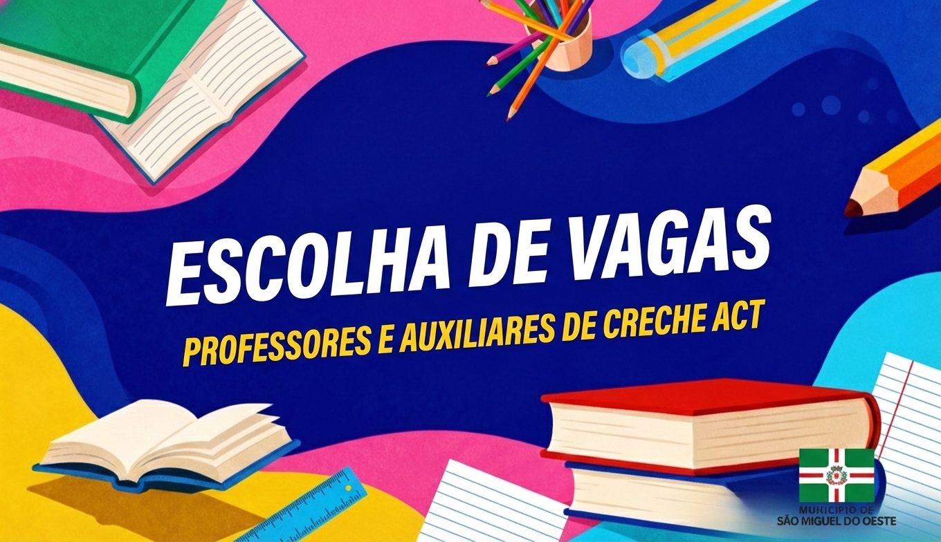 Última atualização: 2026/02/06 9:17:45A Prefeitura de São Miguel do Oeste, por meio da Secretaria Municipal de Educação, divulgou nova convocação para escolha de vagas de professores e auxiliares de creche ACT, conforme o Processo Seletivo nº 001/2025.