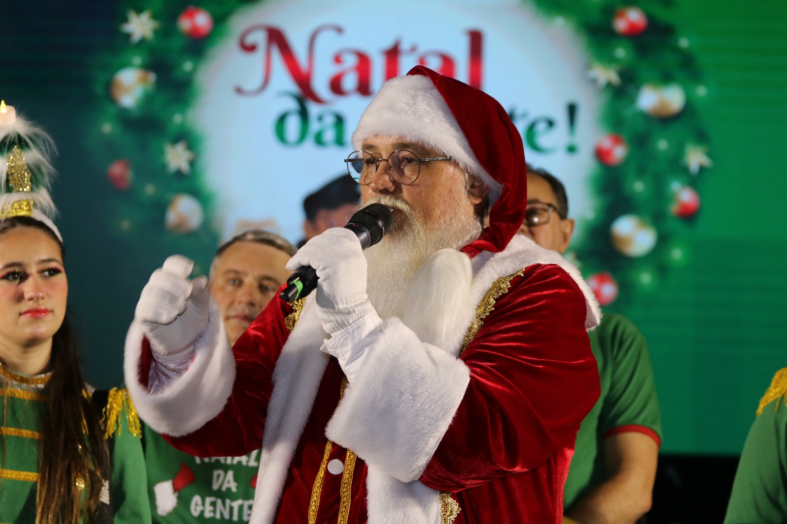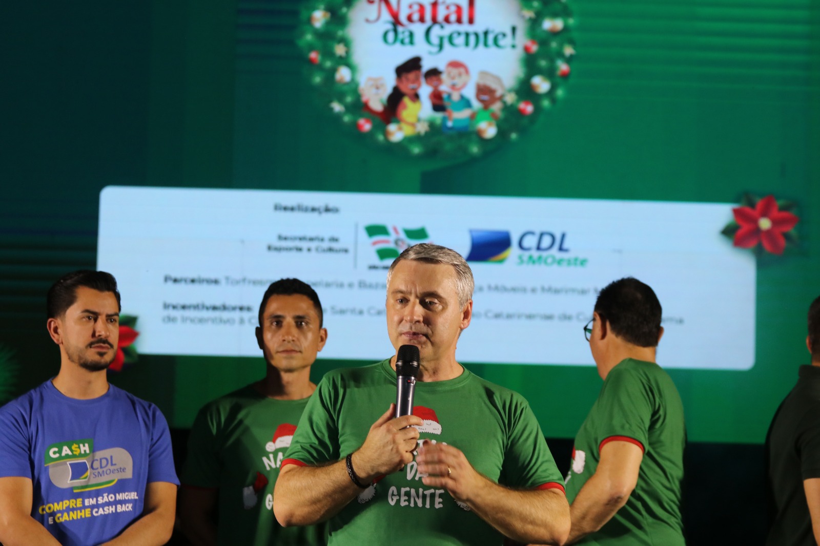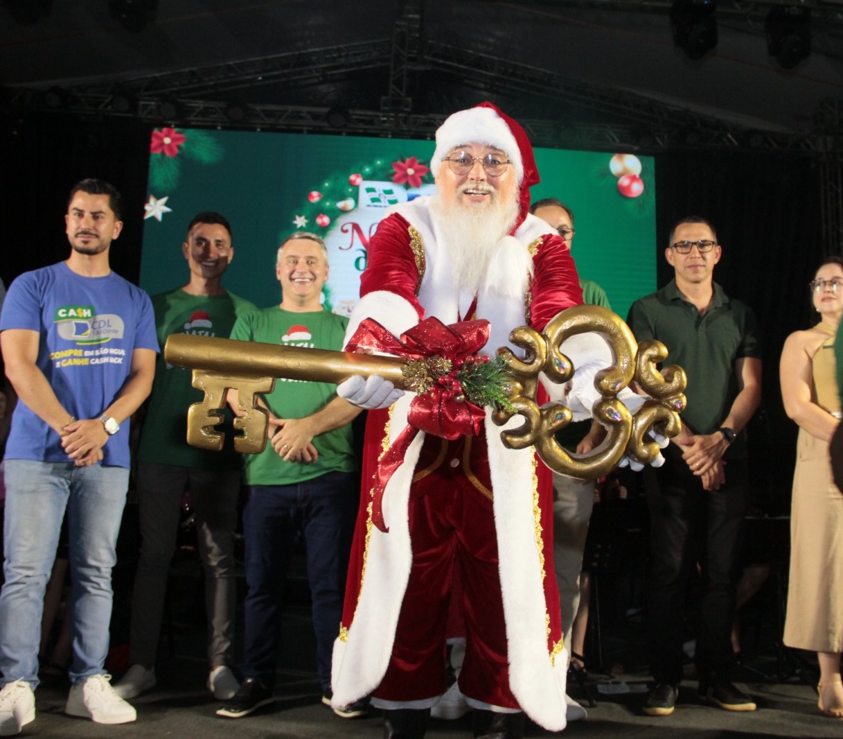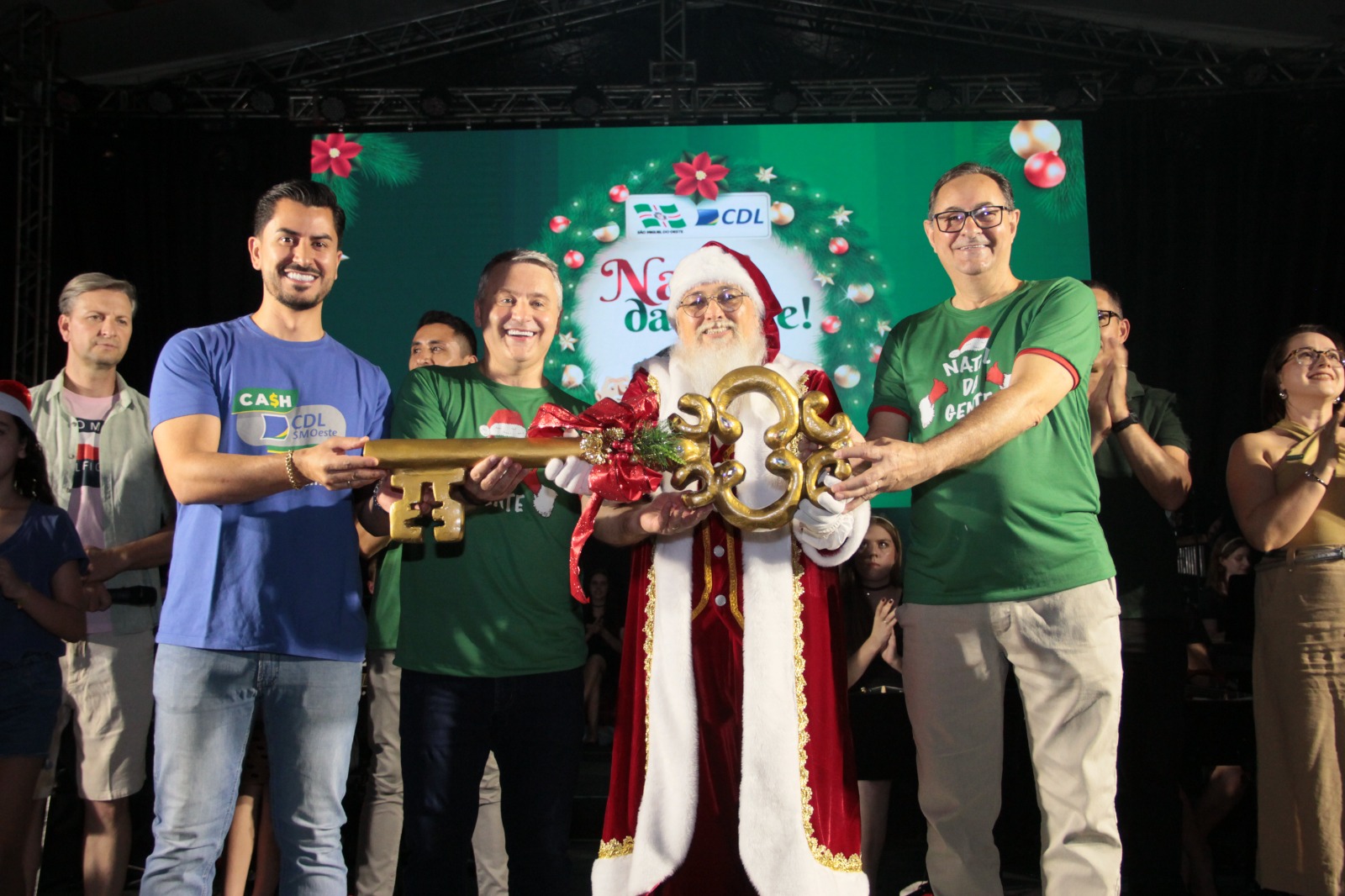 O vice-prefeito Edenilson Zanardi, junto com o presidente da CDL, Juares Junior, secretário Moacir Tommasel, parceiros e incentivadores do “Natal da Gente” 2024, além de vereadores, secretários municipais, lideranças, servidores e equipe do Núcleo Criativo da Cultura, participaram da abertura oficial das festividades no Município.