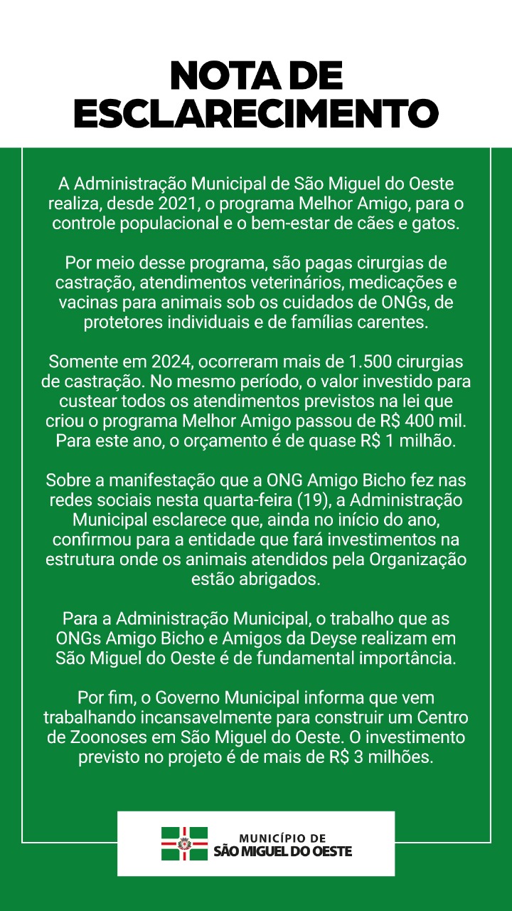 Última atualização: 2025/02/21 9:45:41A Prefeitura de São Miguel do Oeste divulgou uma nota de esclarecimento sobre as ações realizadas no município para o bem-estar e controle populacional de cães e gatos. Segundo o comunicado, desde 2021, a administração municipal mantém o programa Melhor Amigo, que financia cirurgias de castração, atendimentos veterinários, medicações e vacinas para animais sob os cuidados de ONGs, protetores individuais e famílias carentes.