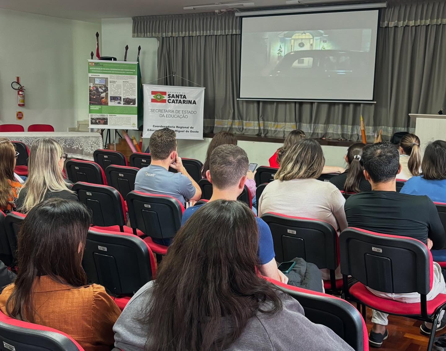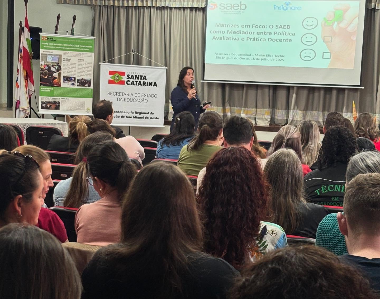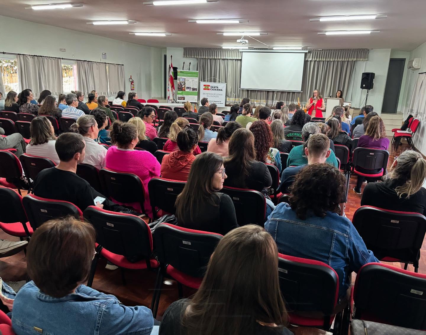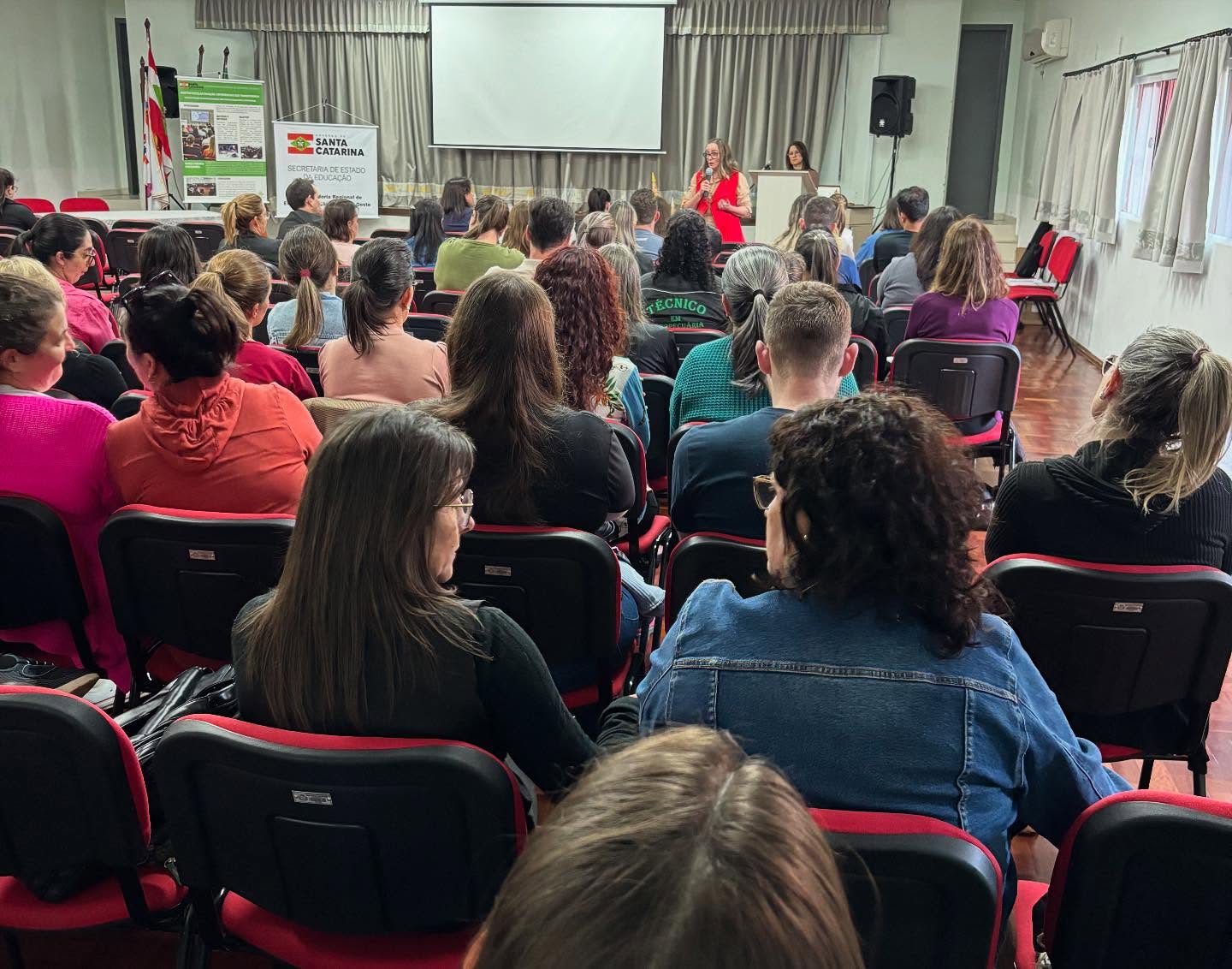 O evento, realizado no auditório da Escola Municipal Emma Balke, reuniu cerca de 90 profissionais da Rede Estadual e representantes da Rede Municipal de São Miguel do Oeste. Estiveram presentes também membros de equipes diretivas e pedagógicas, reforçando o caráter coletivo da formação.