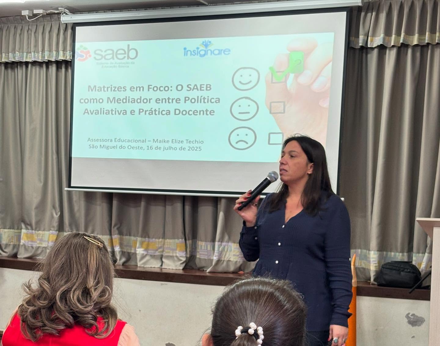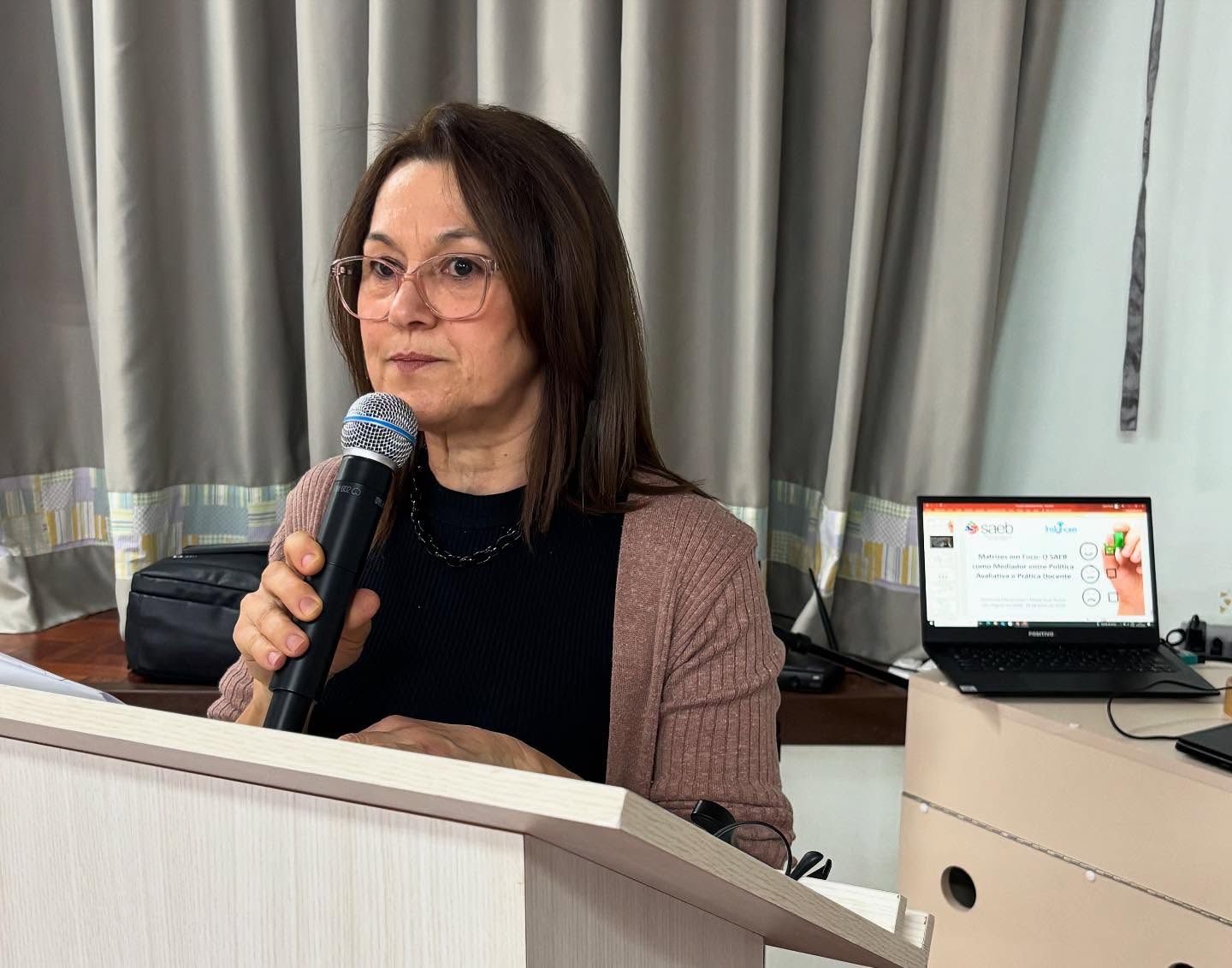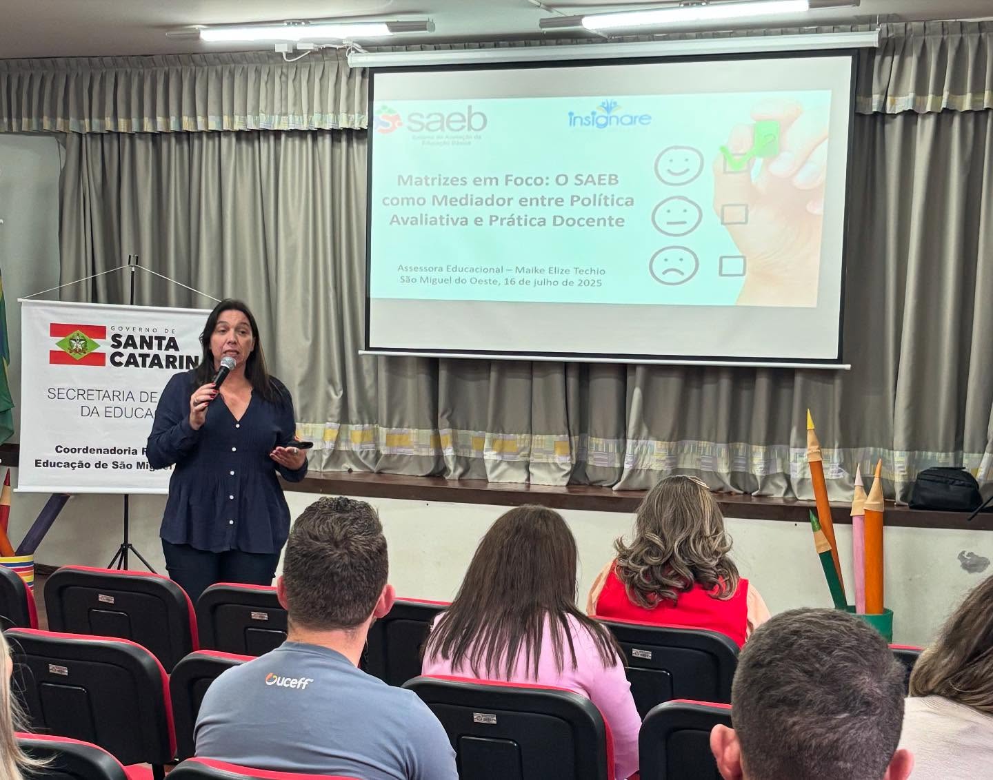A mediação foi conduzida pela assessora educacional Maike Elize Techio, doutoranda em Educação, que abordou a temática “Matrizes em foco: o SAEB como medidor entre política avaliativa e prática docente”. A proposta do encontro foi promover reflexões e análise de dados voltados à melhoria do ensino e da aprendizagem, com base nas diretrizes avaliativas nacionais.