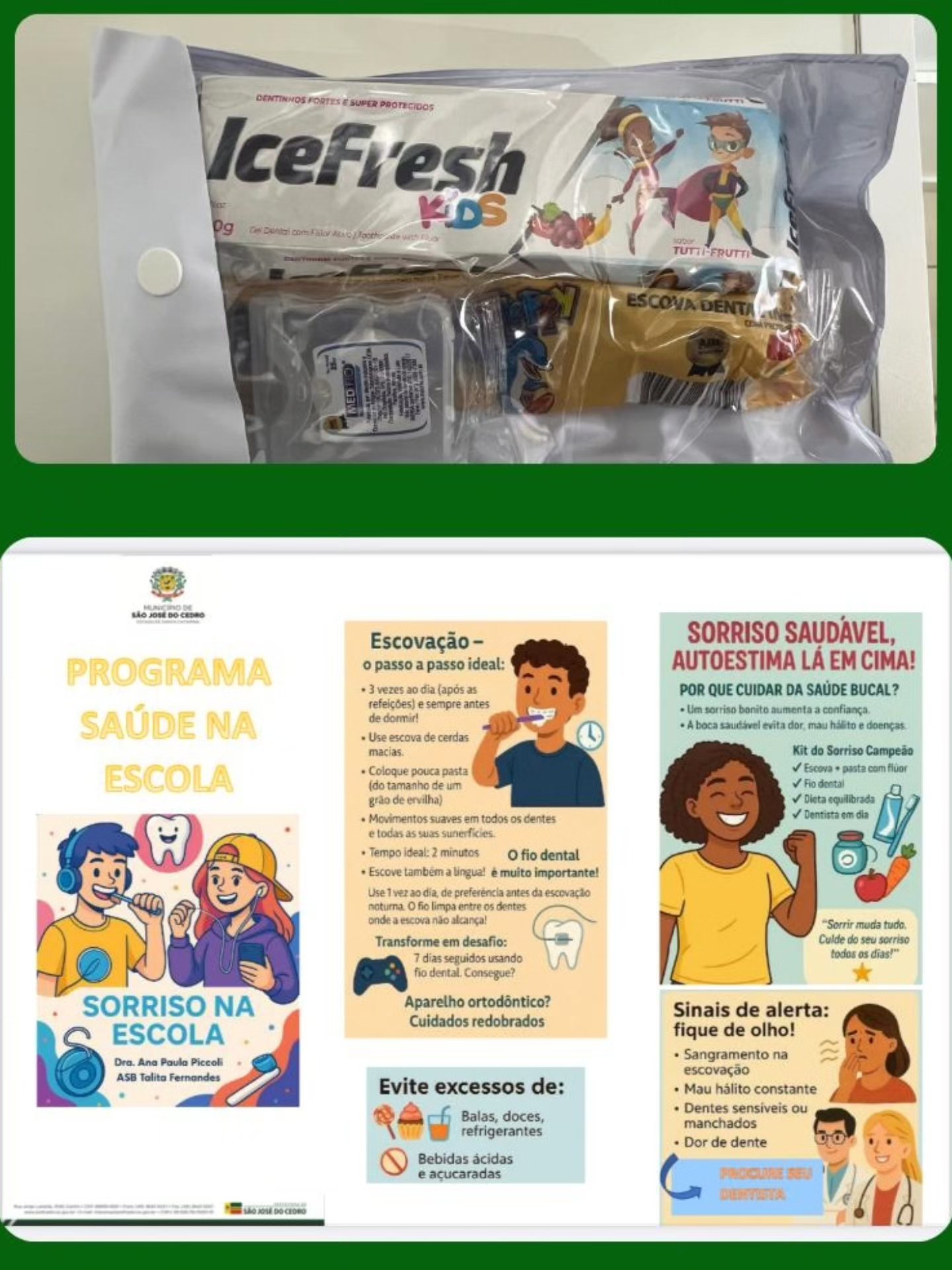 Além da atividade interativa, todos os estudantes receberam kits de higiene bucal e cartilhas informativas. O material distribuído incluiu escova, creme dental e fio dental, acompanhado de orientações práticas sobre os cuidados diários necessários para manter uma boa saúde bucal.