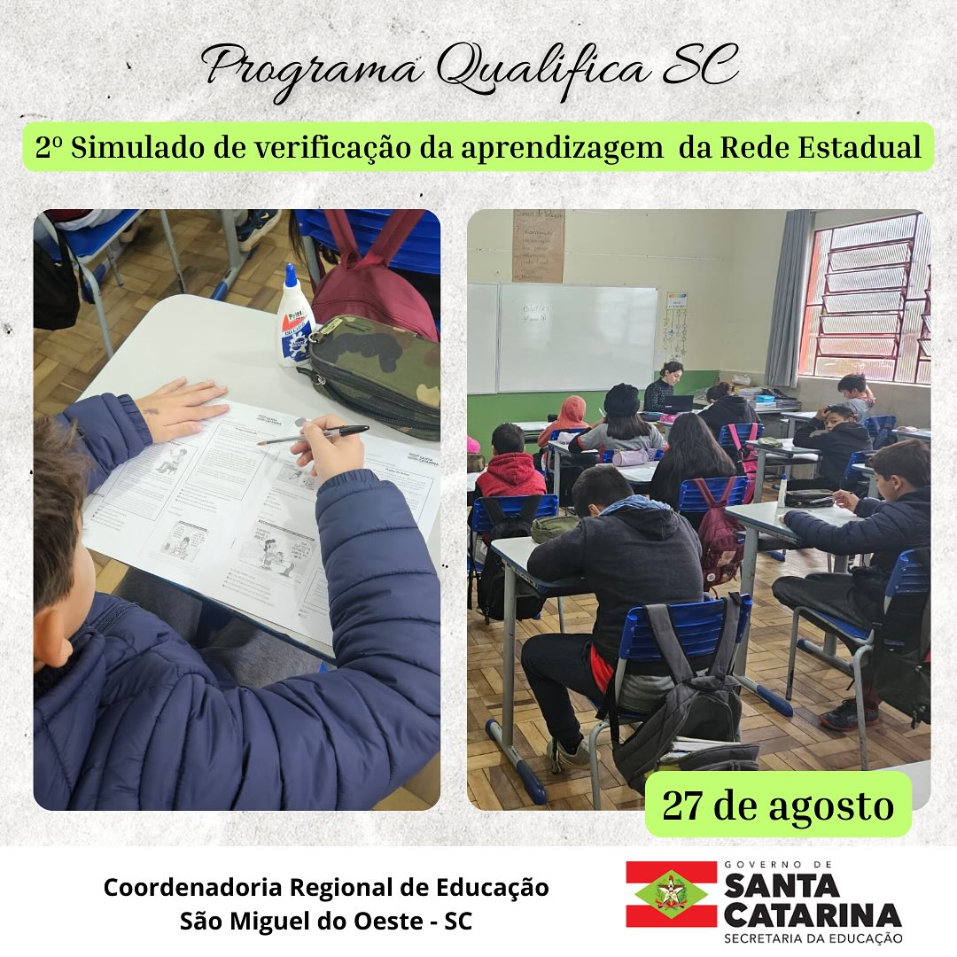 As escolas estaduais de Santa Catarina aplicam nesta quarta-feira, 27 de agosto, o 2º simulado de avaliação da aprendizagem para estudantes do 5º e 9º ano do Ensino Fundamental e da 3ª série do Ensino Médio. A ação envolve as 1.038 unidades escolares da rede estadual e integra o programa Qualifica SC, iniciativa do Governo do Estado voltada à melhoria do processo de ensino e aprendizagem, com foco em equidade e qualidade educacional.