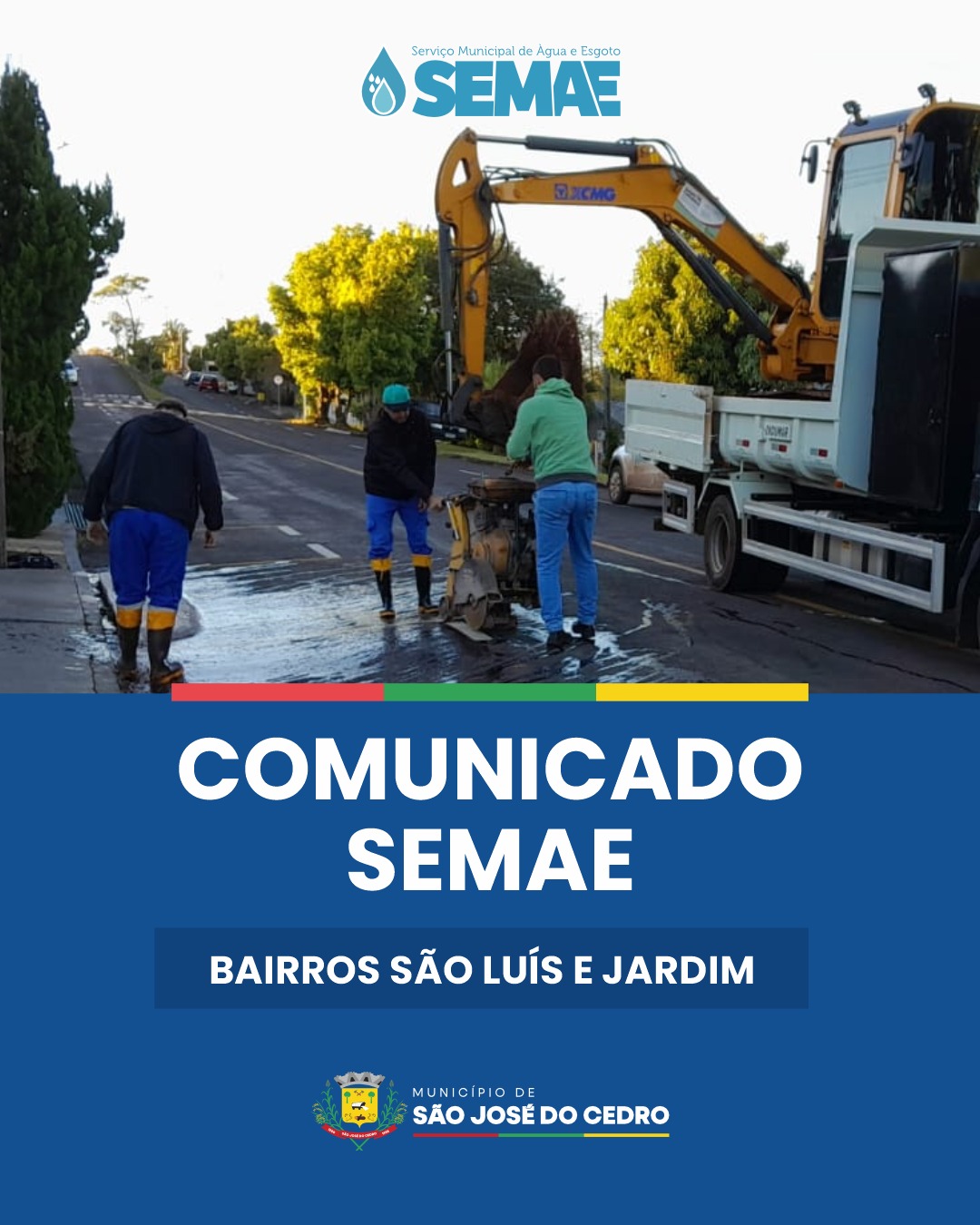 Última atualização: 2025/07/31 8:42:09O Serviço Municipal de Água e Esgoto (SEMAE) de São José do Cedro informou que o fornecimento de água está temporariamente interrompido nos bairros São Luís e Jardim, em razão de um rompimento na rede mestre.