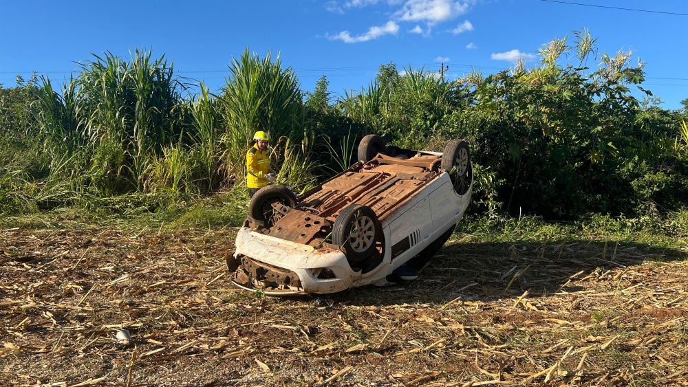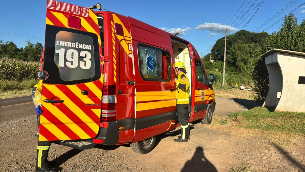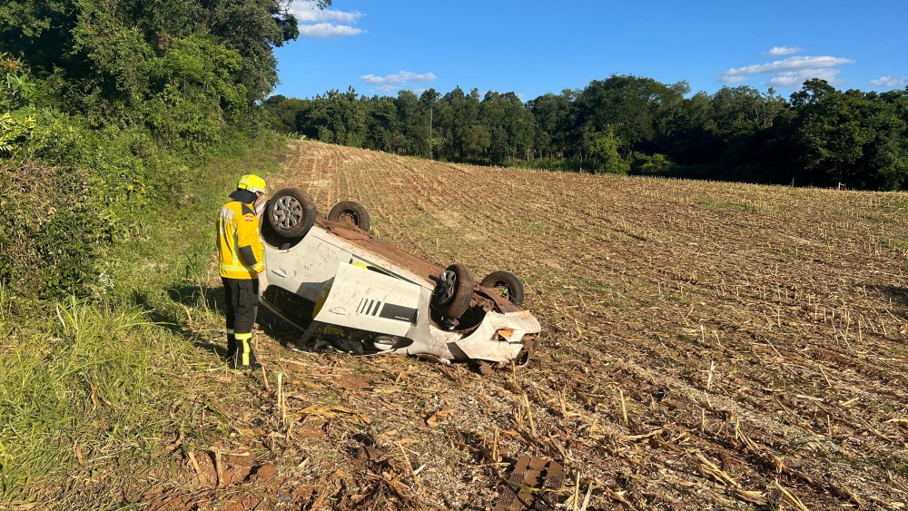 O veículo, que seguia no sentido Bandeirante/São Miguel do Oeste, perdeu o controle ao passar por uma curva com brita na pista, saiu da rodovia e capotou.