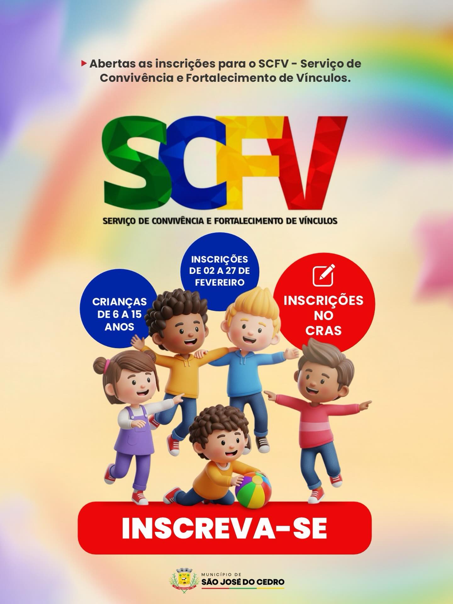 Última atualização: 2026/01/06 2:13:04O Governo Municipal de São José do Cedro, por meio da Secretaria Municipal de Assistência Social e do CRAS, informa à população que estão abertas as inscrições para o Serviço de Convivência e Fortalecimento de Vínculos (SCFV).