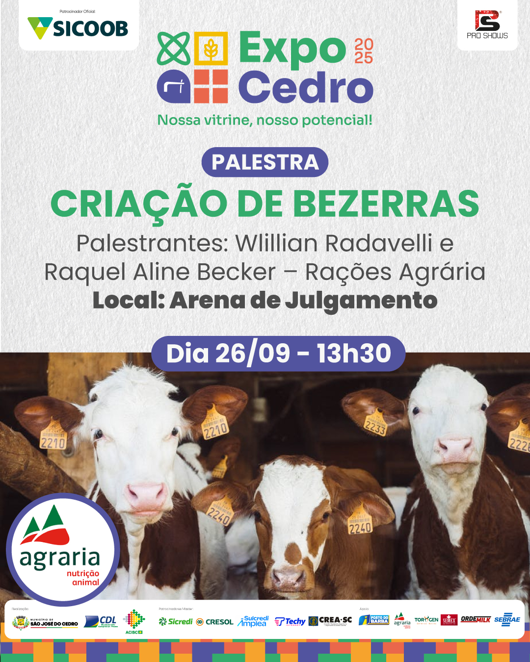 Última atualização: 2025/09/25 8:38:40Dentro da programação técnica da ExpoCedro 2025, haverá a palestra “Criação de Bezerras”, com Wlillian Radavelli e Raquel Aline Becker (Rações Agrária) no dia 26 de setembro, às 13h30 na Arena de Julgamento.