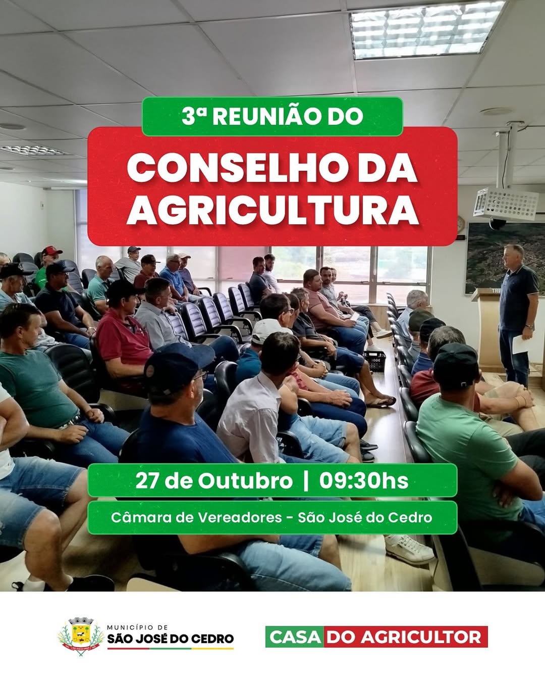 A Secretaria da Agricultura e Infraestrutura, em conjunto com o Conselho da Agricultura de São José do Cedro, realiza na próxima segunda-feira, dia 27 de outubro, a 3ª Reunião do Conselho da Agricultura. O encontro está marcado para as 9h30min, na Câmara de Vereadores.