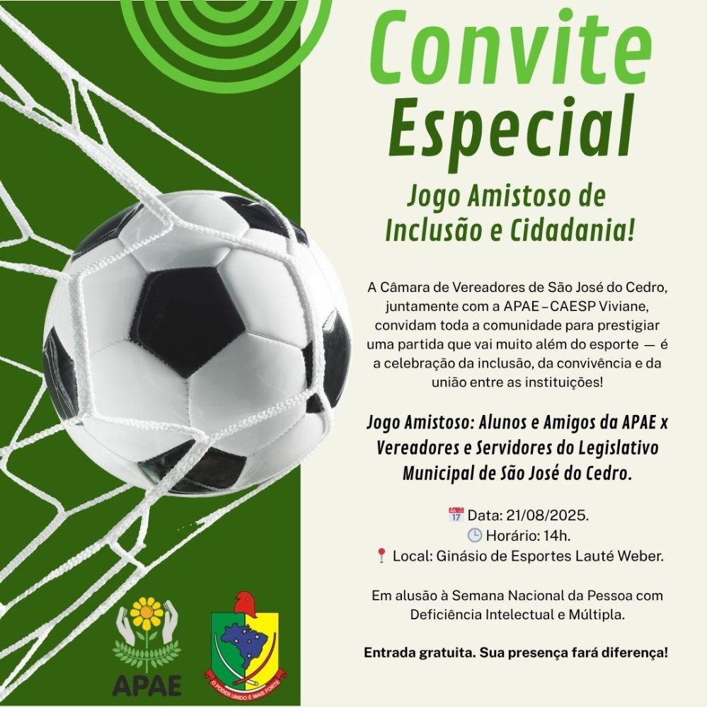 A Câmara de Vereadores de São José do Cedro, em parceria com a APAE – CAESP Viviane, promove no dia 21 de agosto de 2025, às 14h, no Ginásio de Esportes Lauté Weber, um jogo amistoso que pretende ir além da prática esportiva. A atividade faz parte da Semana Nacional da Pessoa com Deficiência Intelectual e Múltipla e tem como propósito valorizar a convivência, a inclusão e o fortalecimento da cidadania.