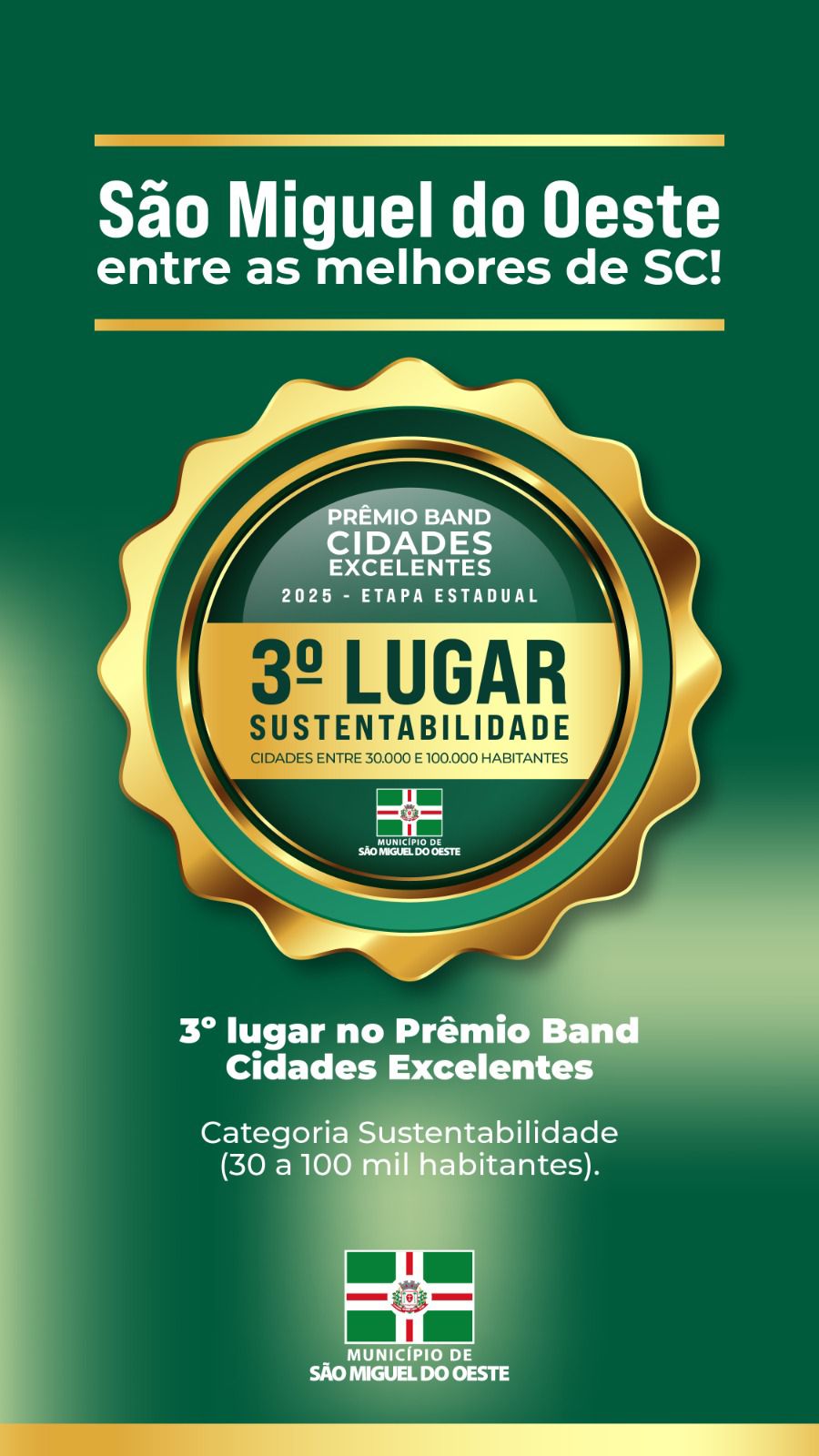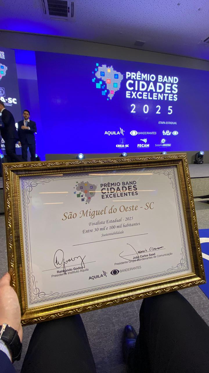 Última atualização: 2025/11/19 3:33:47São Miguel do Oeste se destacou no Prêmio Band Cidades Excelentes 2025, alcançando 3º lugar no Pilar Sustentabilidade entre os municípios de 30 a 100 mil habitantes. O reconhecimento reforça o compromisso da Administração Municipal com políticas públicas responsáveis, planejamento ambiental e ações que promovem qualidade de vida para toda a população.