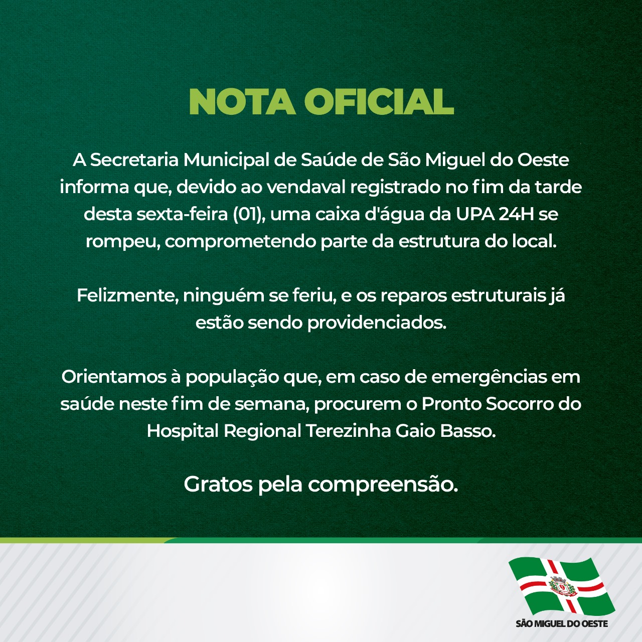 Na noite desta sexta-feira, dia primeiro de novembro, a Secretaria Municipal de Saúde de São Miguel do Oeste emitiu uma nota oficial informando sobre os danos causados pelo forte vendaval que atingiu a região. O fenômeno climático provocou o rompimento de uma caixa d’água na Unidade de Pronto Atendimento (UPA) 24 horas da cidade, comprometendo parte da estrutura do prédio.