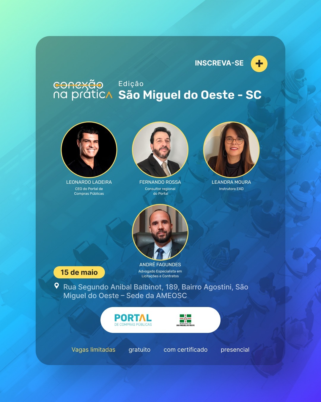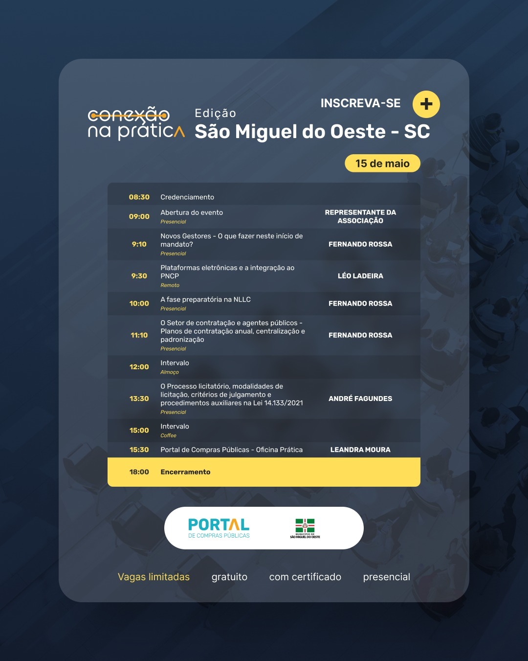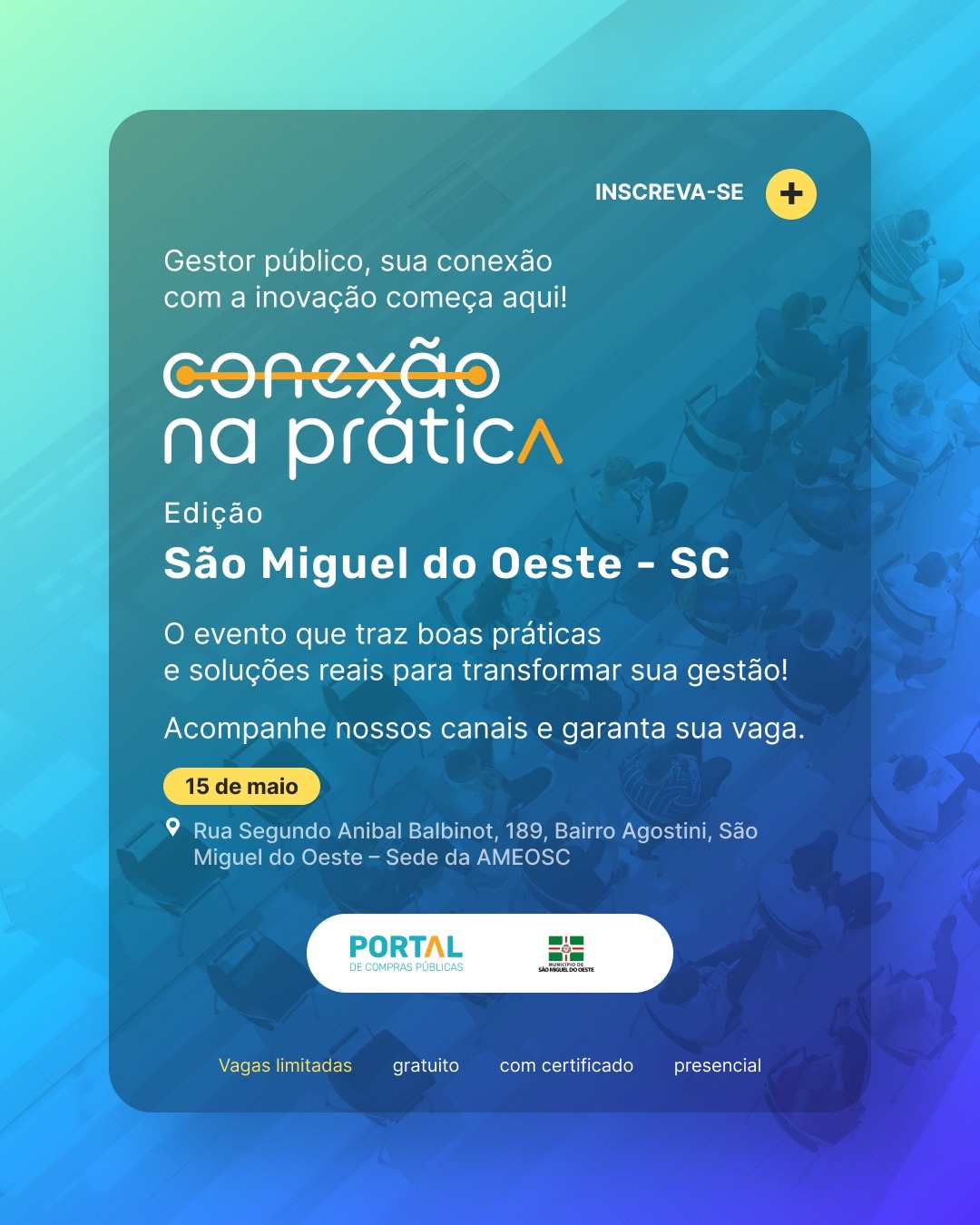 No próximo dia 15 de maio,, São Miguel do Oeste será sede do “Conexão Portal na Prática”, um evento itinerante promovido pelo Portal de Compras Públicas em parceria com o escritório Jacoby Fernandes & Reolon, a Prefeitura de São Miguel do Oeste e a Ameosc (Associação dos Municípios do Extremo Oeste de Santa Catarina). A iniciativa tem como objetivo capacitar compradores públicos municipais e promover total conformidade com a nova Lei de Licitações, a Lei nº 14.133/21.