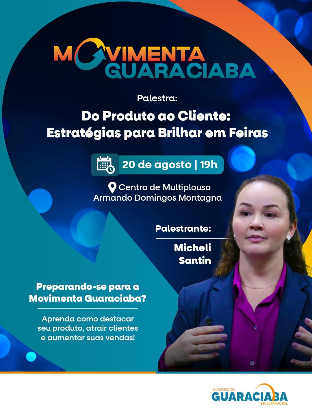 A capacitação será realiza a partir das 19h no centro de múltiplo uso Armando Domingos Montagna, ao lado da Prefeitura, com o tema “Do Produto ao Cliente: Estratégias para Brilhar em Feiras”. A atividade será com a Consultora Micheli Santin que é estrategista de marcas e negócios, especialista em Marketing e Vendas com formação em experiência do cliente e liderança pelo Disney Institute. Consultora e Facilitadora credenciada ao Sebrae, com mais de 10 anos de experiência.