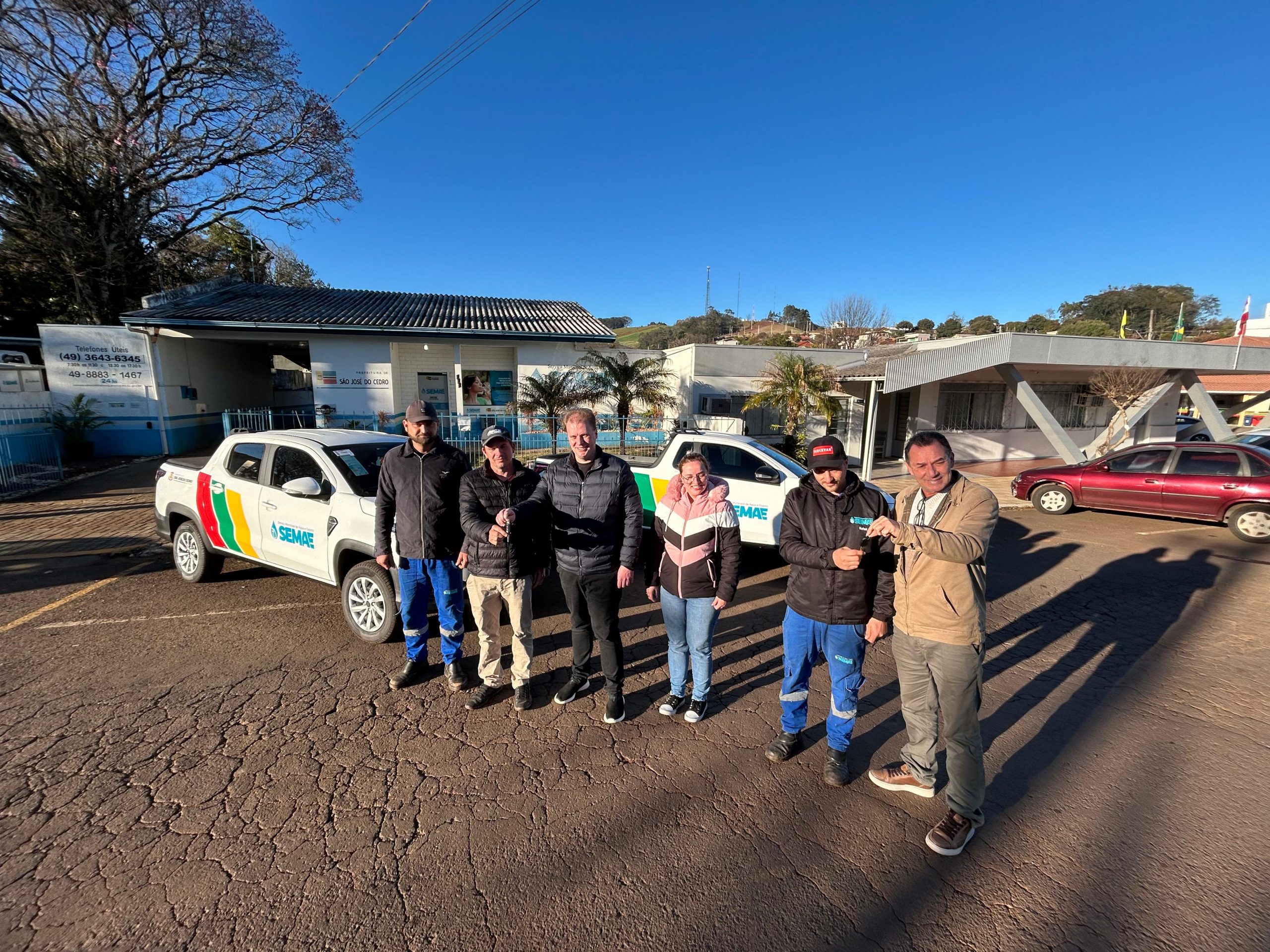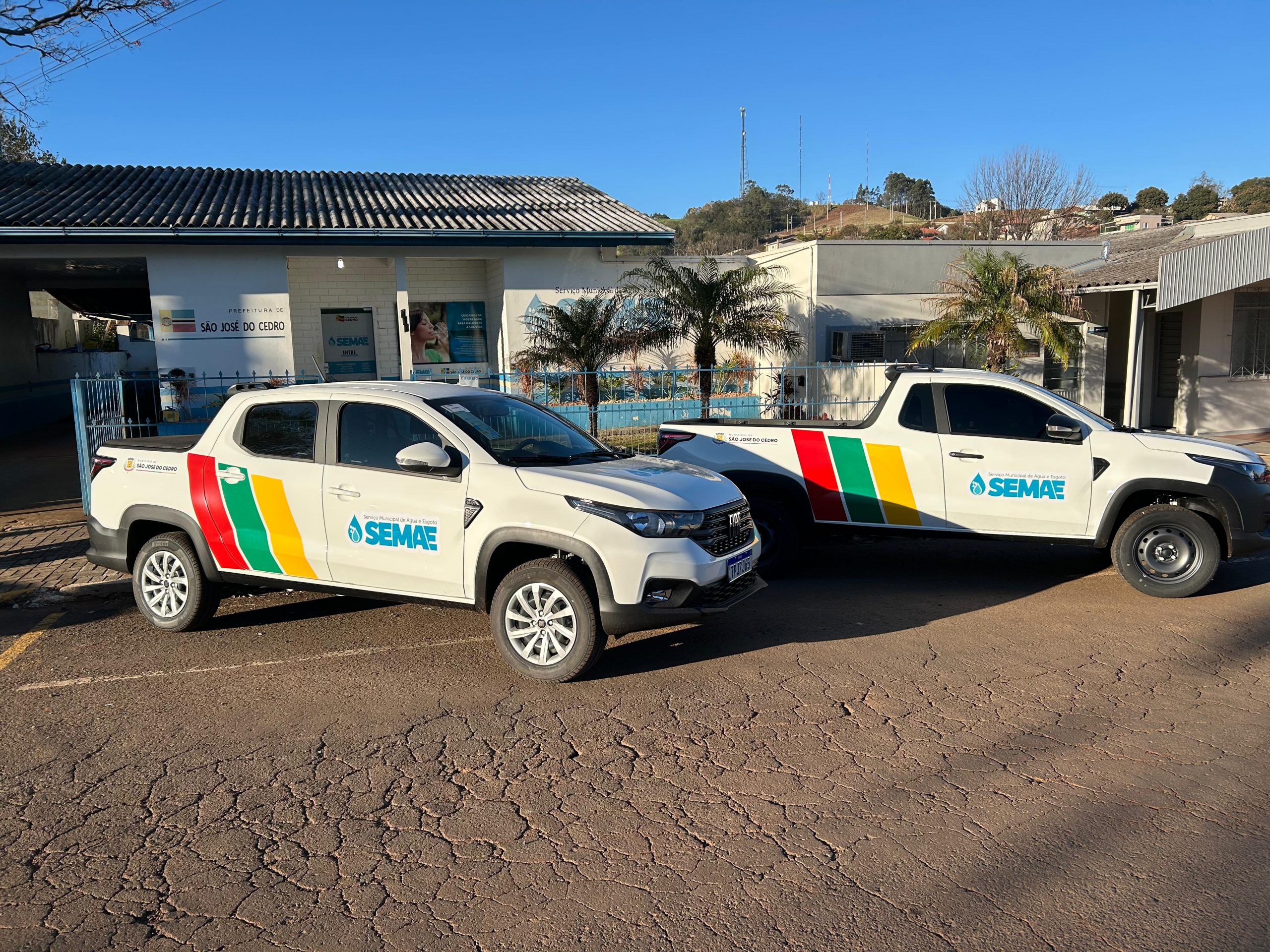 Última atualização: 2025/08/12 10:01:34Na manhã desta terça-feira, o Serviço Municipal de Água e Esgoto (SEMAE) de São José do Cedro recebeu dois novos veículos que serão utilizados nas atividades de manutenção das redes. Trata-se de duas Fiat Strada, modelo 2026, adquiridas com recursos próprios do SEMAE, totalizando um investimento de R$ 219 mil.