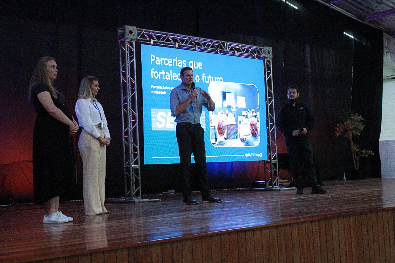 Última atualização: 2025/11/26 11:29:34O Serviço Nacional de Aprendizagem Industrial (SENAI) marcou presença na cerimônia de encerramento da 3ª Jornada Tecnológica em Lógica de Programação promovida pela SKA Tech Hub, realizada no dia 17 de novembro, no Pavilhão Central de Mondaí (SC). O evento celebrou a conclusão de mais uma turma do polo formativo, iniciativa que, desde 2023, amplia o acesso à tecnologia e estimula o desenvolvimento de competências profissionais na região.
