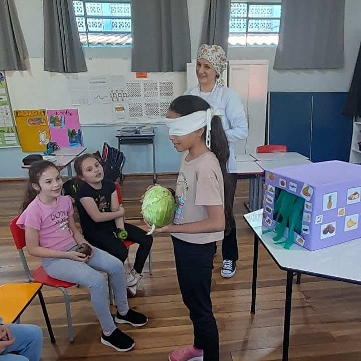 A primeira atividade, chamada “Cabra Cega dos Alimentos” proporcionou uma experiência sensorial aos alunos, que vendados, tiveram o desafio de descobrir quais alimentos estavam experimentando ou tocando, reconhecendo frutas e legumes somente pelo tato, olfato e paladar.